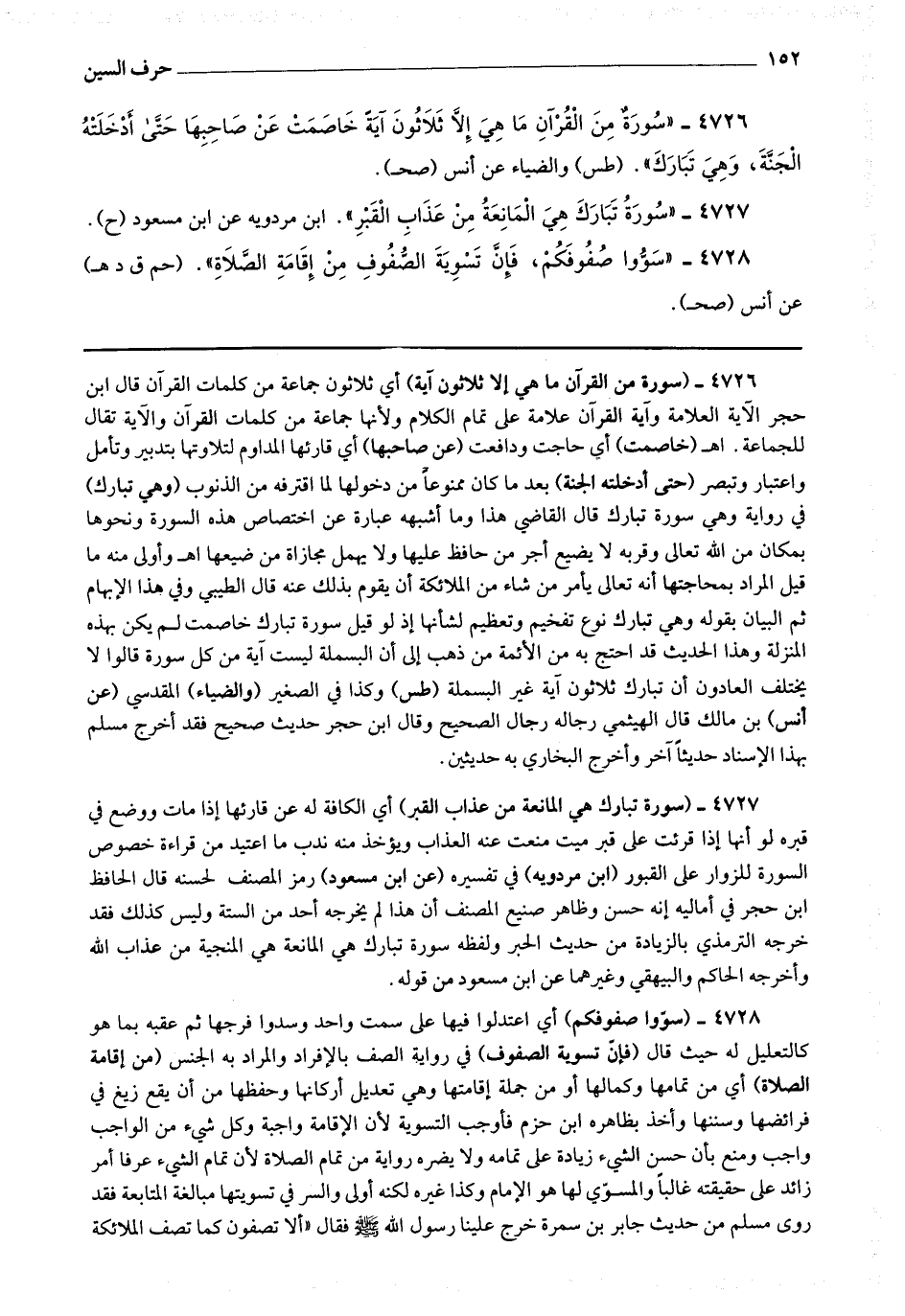 4727 - (سورة تبارك هي المانعة من عذاب القبر) أي الكافة له عن قارئها إذا مات ووضع في قبره لو أنها إذا قرئت على قبر ميت منعت عنه العذاب ويؤخذ منه ندب ما اعتيد من قراءة خصوص السورة للزوار على القبور.