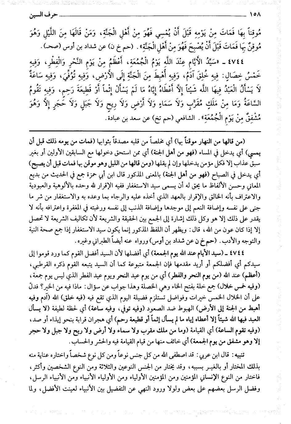 على أن الخلال الخمس خيرات وفواضل تستلزم فضيلة اليوم الذي تقع فيه (فيه خلق) الله (آدم وفيه أهبط من الجنة إلى الأرض) الهبوط ضد الصعود (وفيه توفي وفيه ساعة) أي لحظة لطيفة (لا يسأل العبد فيها الله شيئا إلا أعطاه إياه ما لم يسأل إثما أو قطيعة رحم) أي هجران قرابة بنحو إيذاء أو صد (وفيه تقوم الساعة) أي القيامة (وما من ملك مقرب ولا سماء ولا أرض ولا ريح ولا جبل ولا حجر إلا وهو مشفق من يوم الجمعة) أي خائف منها من قيام القيامة فيه والحشر والحساب (تنبيه) قال ابن عربي : قد اصطفى الله من كل جنس نوعا ومن كل نوع شخصا واختاره عناية منه بذلك المختار أو بالغير بسببه وقد يختار من الجنس النوعين والثلاثة ومن النوع الشخصين وأكثر فاختار من النوع الإنساني المؤمنين ومن المؤمنين الأولياء ومن الأولياء الأنبياء ومن الأنبياء الرسل وفضل الرسل بعضهم على بعض ولولا ورود النهي عن التفضيل بين الأنبياء لعينت الأفضل ولما