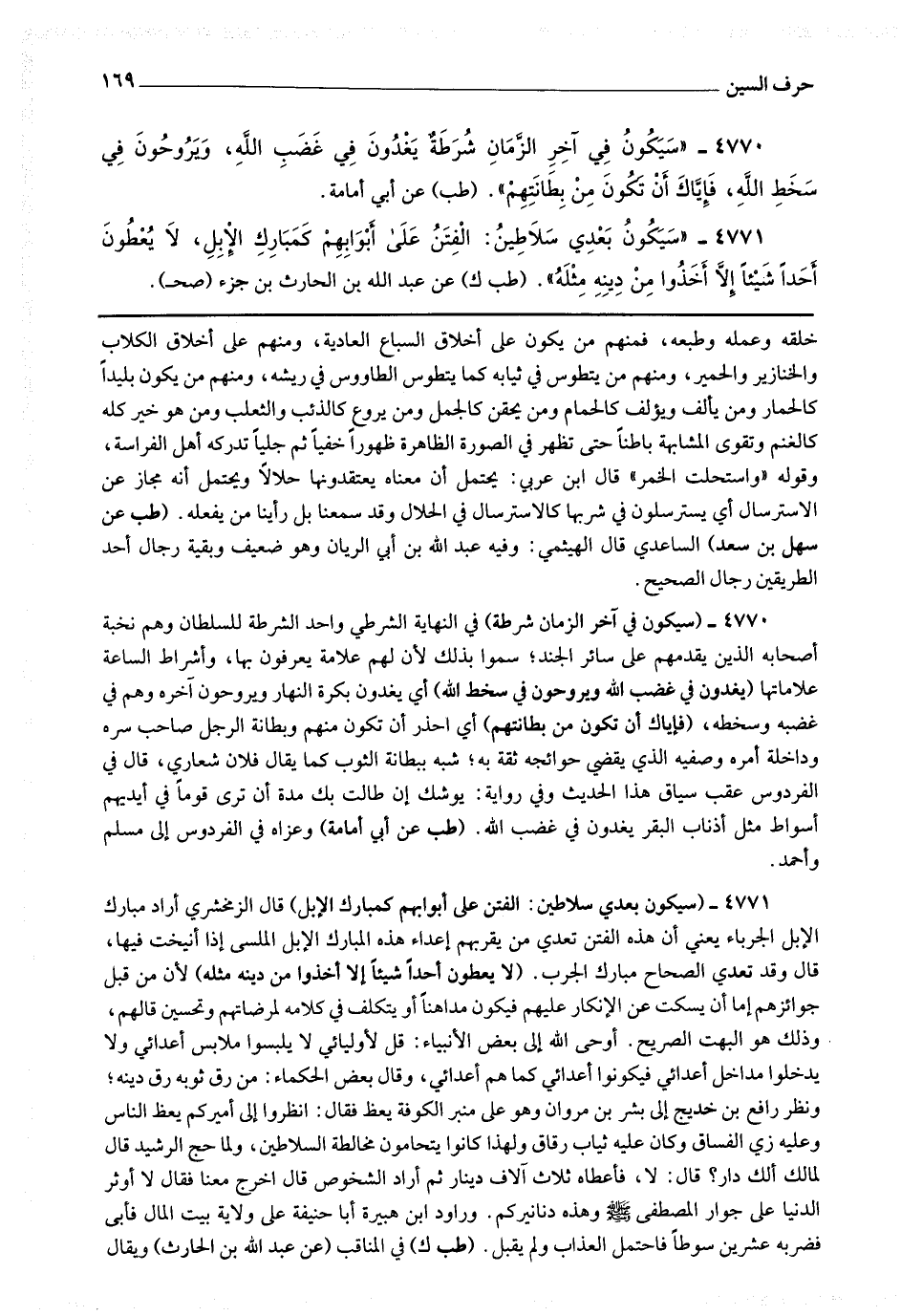 4771 - (سيكون بعدي سلاطين : الفتن على أبوابهم كمبارك الإبل) قال الزمخشري : أراد مبارك الإبل الجرباء يعني أن هذه الفتن تعدي من يقربهم أعداء هذه المبارك الإبل الملسى إذا أنيخت فيها قال : وقد تعدي الصحاح مبارك الجرب (لا يعطون أحدا شيئا إلا أخذوا من دينه مثله) لأن من قبل جوائزهم إما أن يسكت عن الإنكار عليهم فيكون مداهنا أو يتكلف في كلامه لمرضاته وتحسين قالهم وذلك هو البهت الصريح.