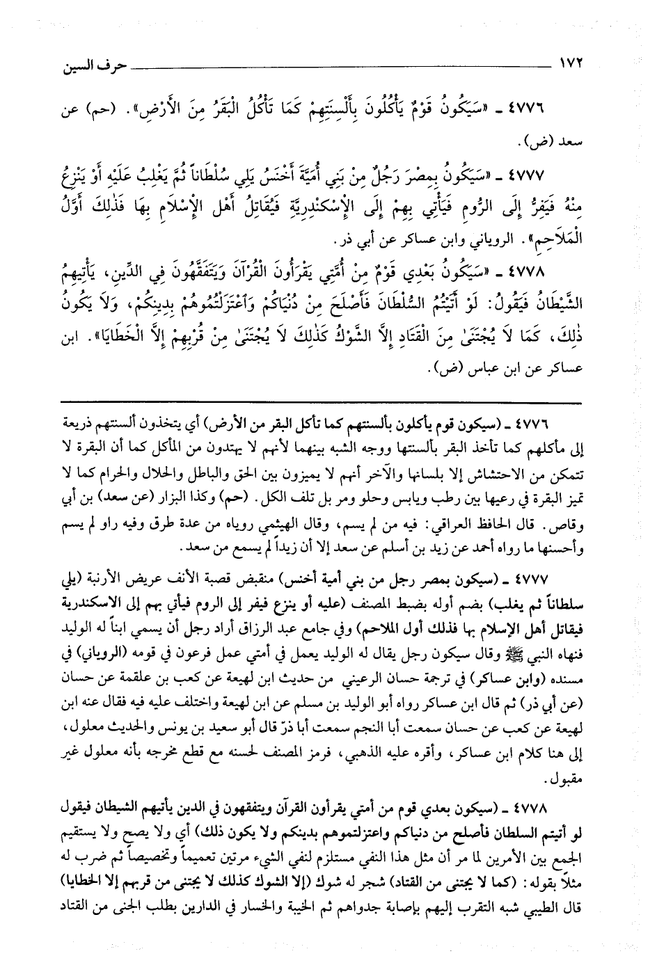 4776 - (سيكون قوم يأكلون بألسنتهم كما تأكل البقر من الأرض) أي يتخذون ألسنتهم ذريعة إلى مأكلهم كما تأخذ البقر بألسنتها ووجه الشبه بينهما لأنهم لا يهتدون من المأكل كما أن البقرة لا تتمكن من الاحتشاش إلا بلسانها والآخر أنهم لا يميزون بين الحق والباطل والحلال والحرام كما لا تميز البقرة في رعيها بين رطب ويابس وحلو ومر بل تلف الكل.