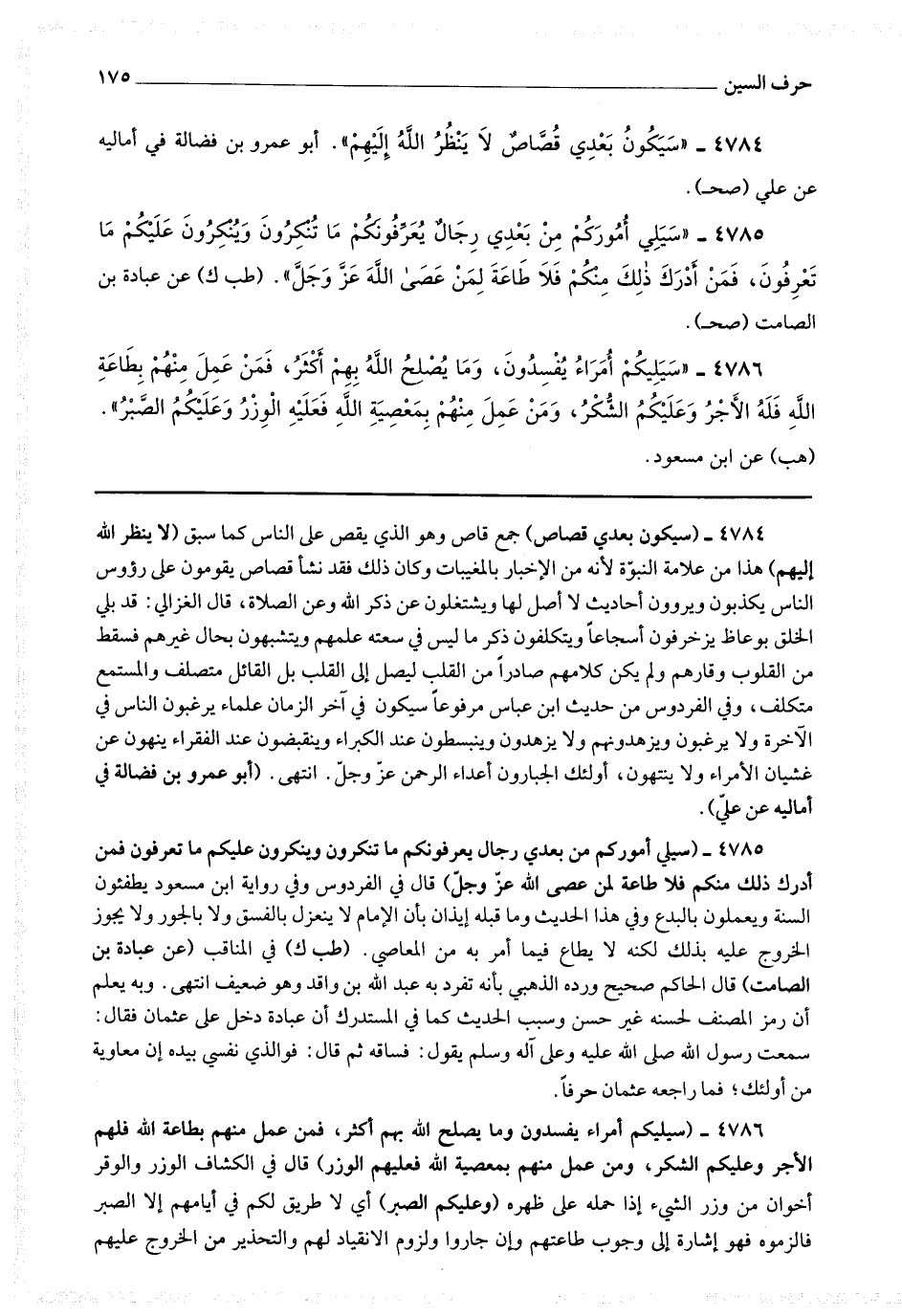 4785 - (سيلي أموركم من بعدي رجال يعرفونكم ما تنكرون وينكرون عليكم ما تعرفون فمن أدرك ذلك منكم فلا طاعة لمن عصى الله عز وجل) قال في الفردوس : وفي رواية ابن مسعود يطفئون السنة ويعملون بالبدع وفي هذا الحديث وما قبله إيذان بأن الإمام لا ينعزل بالفسق ولا بالجور ولا يجوز الخروج عليه بذلك لكنه لا يطاع فيما أمر به من المعاصي.