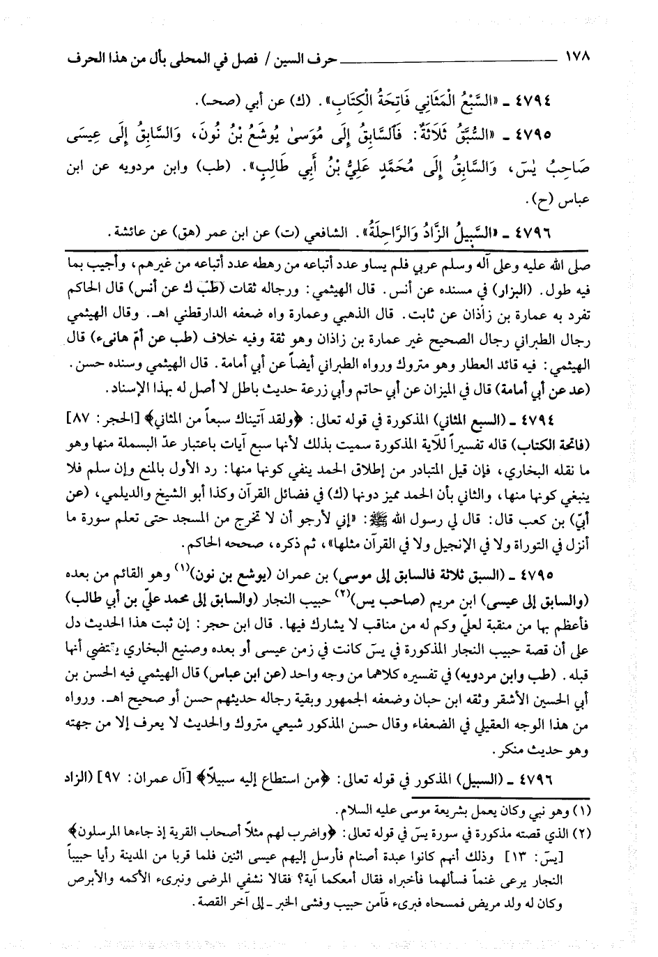 4794 - (السبع المثاني) المذكورة في قوله تعالى * (ولقد آتيناك سبعا من المثاني) * (فاتحة الكتاب) قاله تفسيرا للآية المذكورة سميت بذلك لأنها سبع آيات باعتبار عد البسملة منها وهو ما نقله البخاري ، فإن قيل المتبادر من إطلاق الحمد ينفي كونها منها : رد الأول بالمنع وإن سلم فلا ينبغي كونها منها والثاني بأن الحمد مميز دونها.