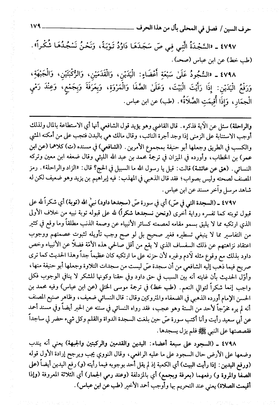 4798 - (السجود على سبعة أعضاء : اليدين والقدمين والركبتين والجبهة) يعني أنه يندب وضعها على الأرض حال السجود على ما عليه الرافعي وقال النووي : يجب ويرجح إرادة الأول قوله (ورفع اليدين : إذا رأيت البيت) أي الكعبة إذ لم يقل أحد بوجوبه فيما رأيته (و) رفع اليدين أيضا (على الصفا والمروة و) رفعهما (بعرفة وبجمع) أي بالمزدلفة (وعند رمي الجمار) أي الثلاثة المعروفة (وإذا أقيمت الصلاة) يعني عند التحريم بها وأوجب أحمد الأخير.