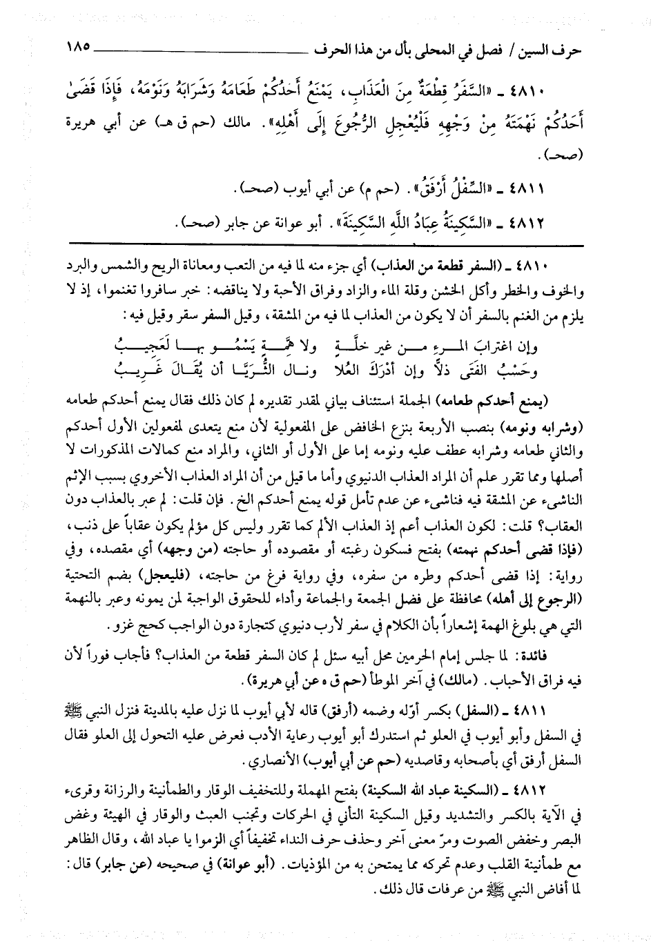4810 - (السفر قطعة من العذاب) أي جزء منه لما فيه من التعب ومعاناة الريح والشمس والبرد والخوف والخطر وأكل الخشن وقلة الماء والزاد وفراق الأحبة ولا يناقضه خبر سافروا تغنموا إذ لا يلزم من الغنم بالسفر أن لا يكون من العذاب لما فيه من المشقة وقيل: السفر سقر.