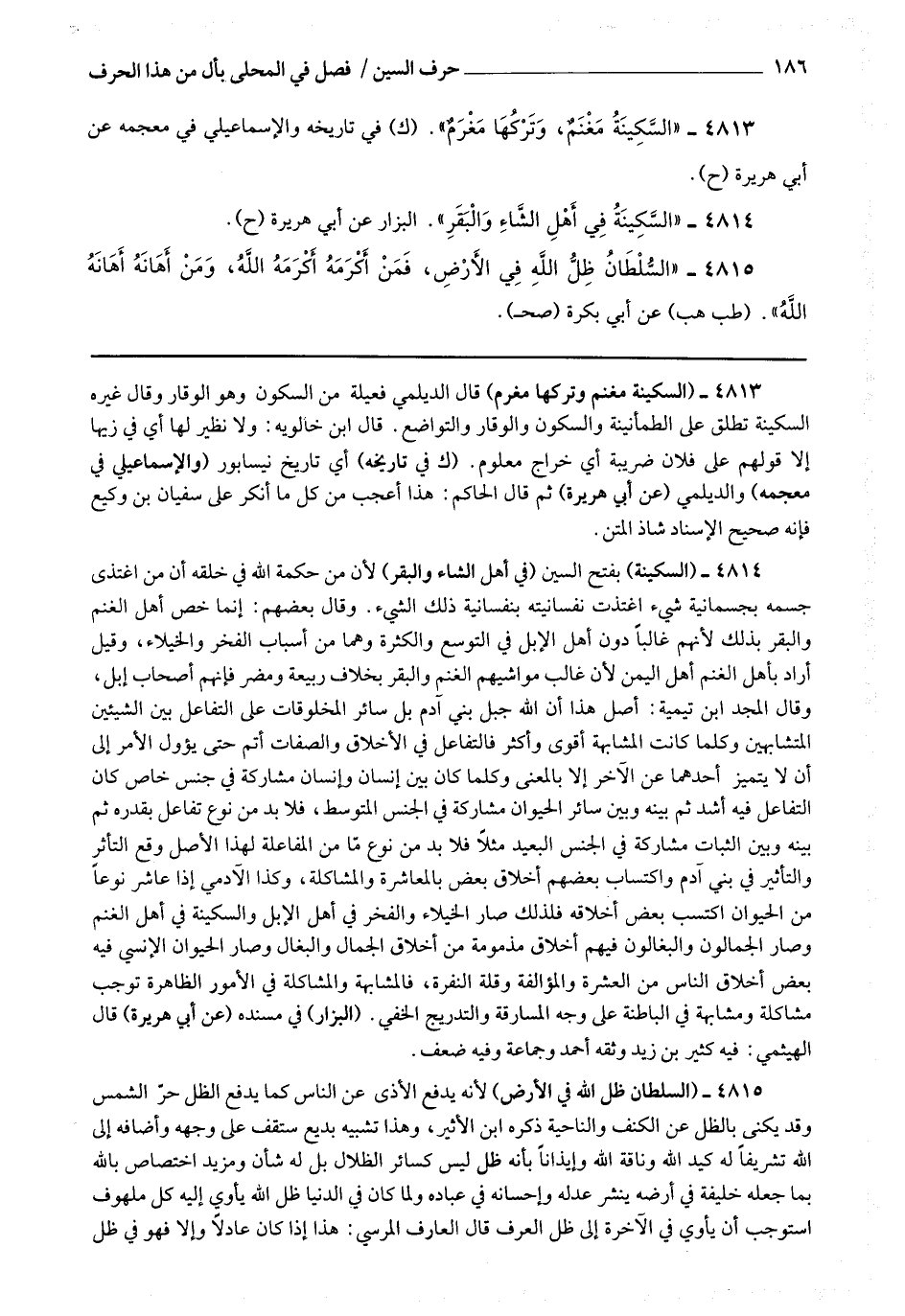 4814 - (السكينة) بفتح السين (في أهل الشاء والبقر) لأن من حكمة الله في خلقه أن من اغتذى جسمه بجسمانية شئ اغتذت نفسانيته ذلك الشئ ، وقال بعضهم : إنما خص أهل الغنم والبقر بذلك لأنهم غالبا دون أهل الإبل في التوسع والكثرة وهما من أسباب الفخر والخيلاء وقيل : أراد بأهل الغنم أهل اليمن لأن غالب مواشيهم الغنم والبقر بخلاف ربيعة ومضر فإنهم أصحاب إبل وقال المجد بن تيمية : أصل هذا أن الله جبل بني آدم بل سائر المخلوقات على التفاعل بين الشيئين المتشابهين وكلما كانت المشابهة أقوى وأكثر فالتفاعل في الأخلاق والصفات أتم حتى يؤول الأمر إلى