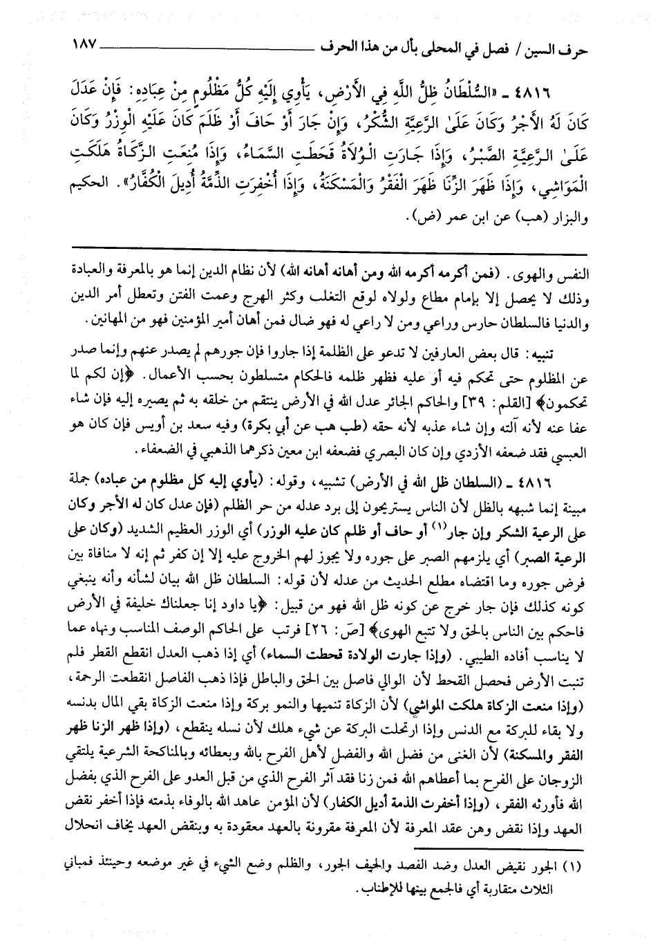 4816 - (السلطان ظل الله في الأرض) تشبيه وقوله (يأوي إليه كل مظلوم من عباده) جملة مبينة إنما شبهه بالظل لأن الناس يستريحون إلى برد عدله من حر الظلم (فإن عدل كان له الأجر وكان على الرعية الشكر وإن جار (1) أو حاف أو ظلم كان عليه الوزر) أي الوزر العظيم الشديد (وكان على الرعية الصبر) أي يلزمهم الصبر على جوره ولا يجوز لهم الخروج عليه إلا إن كفر ثم إنه لا منافاة بين فرض جوره وما اقتضاه مطلع الحديث من عدله لأن قوله السلطان ظل الله بيان لشأنه وأنه ينبغي كونه كذلك فإذا جار خرج عن كونه ظل الله فهو من قبيل * (يا داود إنا جعلناك خليفة في الأرض فاحكم بين الناس بالحق ولا تتبع الهوى) * فرتب على الحاكم الوصف المناسب ونهاه عما لا يناسب أفاده الطيبي (وإذا جارت الولاة قحطت السماء) أي إذا ذهب العدل انقطع القطر فلم تنبت الأرض فحصل القحط لأن الوالي فاصل بين الحق والباطل فإذا ذهب الفاضل انقطعت الرحمة (وإذا منعت الزكاة هلكت المواشي) لأن الزكاة تنميها والنمو بركة وإذا منعت الزكاة بقي المال بدنسه ولا بقاء للبركة مع الدنس وإذا ارتحلت البركة عن شئ هلك لأن نسله ينقطع (وإذا ظهر الزنا ظهر الفقر والمسكنة) لأن الغنى من فضل الله والفضل لأهل الفرح بالله وبعطائه وبالمناكحة الشرعية يلتقي الزوجان على الفرح بما أعطاهم الله فمن زنا فقد آثر الفرح الذي من قبل العدو على الفرح الذ بفضل الله فأورثه الفقر (وإذا أخفرت الذمة أديل الكفار) لأن المؤمن عاهد الله بالوفاء بذمته فإذا أخفر نقض العهد وإذا نقض وهن عقد المعرفة لأن المعرفة مقرونة بالعهد معقودة به وبنقض العهد يخاف انحلال