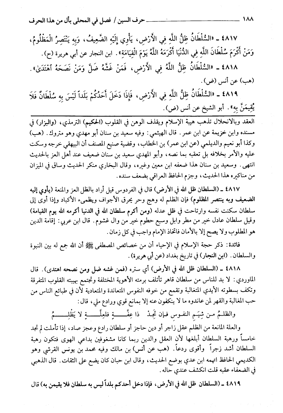 4818 - (السلطان ظل الله في الأرض) أي ستره (فمن غشه ضل ومن نصحه اهتدى) قال الماوردي : لا بد للناس من سلطان قاهر تأتلف برهبته الأدوية المخيفة وتجتمع بهيبته القلوب المتفرقة وتكف بسطوته الأيدي المتغالبة وتقمع من خوفه النفوس المتعاندة والمتعادية لأن في طبائع الناس من حب المغالبة والقهر لمن عاندوه ما لا ينكفون عنه إلا بمانع قوي ورادع ملي ، قال : والظلم من شيم النفوس فإن تجد * ذا عفة فلعلة لا يظلم والعلة المانعة من الظلم عقل زاجر أو دين حاجز أو سلطان رادع وعجز صاد ، إذا تأملت لم تجد خامسا ورهبة السلطان أبلغها لأن العقل والدين ربما كانا مشغوفين بداعي الهوى فتكون رهبة السلطان أشد زجرا وأقوى ردعا.