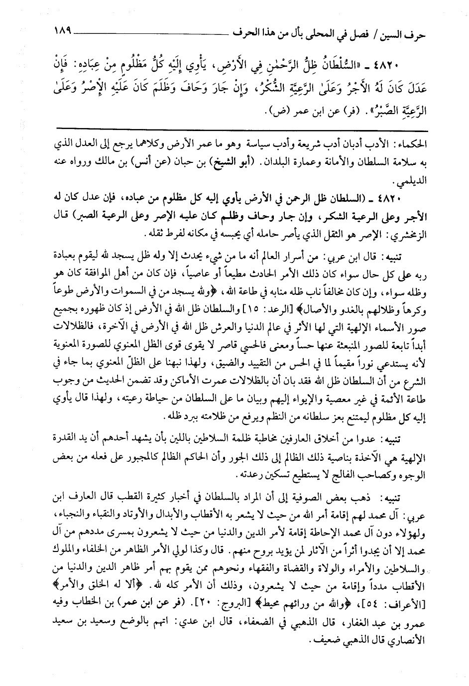 4820 - (السلطان ظل الرحمن في الأرض يأوي إليه كل مظلوم من عباده فإن عدل كان له الأجر وعلى الرعية الشكر وإن جار وحاف وظلم كان عليه الإصر وعلى الرعية الصبر) قال الزمخشري : الإصر هو الثقل الذي يأصر حامله أي يحبسه في مكانه لفرط ثقله (تنبيه) قال ابن عربي : من أسرار العالم أنه ما من شئ يحدث إلا وله ظن يسجد لله ليقوم بعبادة ربه على كل حال سواء كان ذلك الأمر الحادث مطيعا أو عاصيا فإن كان من أهل الموافقة كان هو وظله سواء وإن كان مخالفا أناب ظله منابه في طاعة الله * (ولله يسجد من في السماوات والأرض طوعا وكرها وظلالهم بالغدو والأصال) * والسلطان ظل الله في الأرض إذ كان ظهوره بجميع صور الأسماء الإلهية التي لها أثر في عالم الدنيا والعرش ظل الله في الأرض في الآخرة فالظلالات أبدا تابعة للصور المنبعثة عنها حسا ومعنى فالحسي قاصر لا يقوى قوى الظل المعنوي للصورة المعنوية لأنه يستدعي نورا مقيما لما في الحس من التقييد والضيق ولهذا نبهنا على الظل المعنوي بما جاء في الشرع من أن السلطان ظل الله فقد بان أن بالظلالات عمرت الأماكن وقد تضمن الحديث من وجوب طاعة الأئمة في غير معصية والإيواء إليهم وبيان ما على السلطان من حياطة رعيته ولهذا قال يأوي إليه كل مظلوم ليمتنع بعز سلطانه من التظلم ويرفع من ظلامته ببرد ظله (تنبيه) عدوا من أخلاق العارفين مخاطبة ظلمة السلاطين باللين بأن يشهد أحدهم أن يد القدرة الإلهية هي الآخذة بناصية ذلك الظالم إلى ذلك الجور وأن الحاكم الظالم كالمجبور على فعله من بعض الوجوه وكصاحب الفالج لا يستطيع تسكين رعدته.