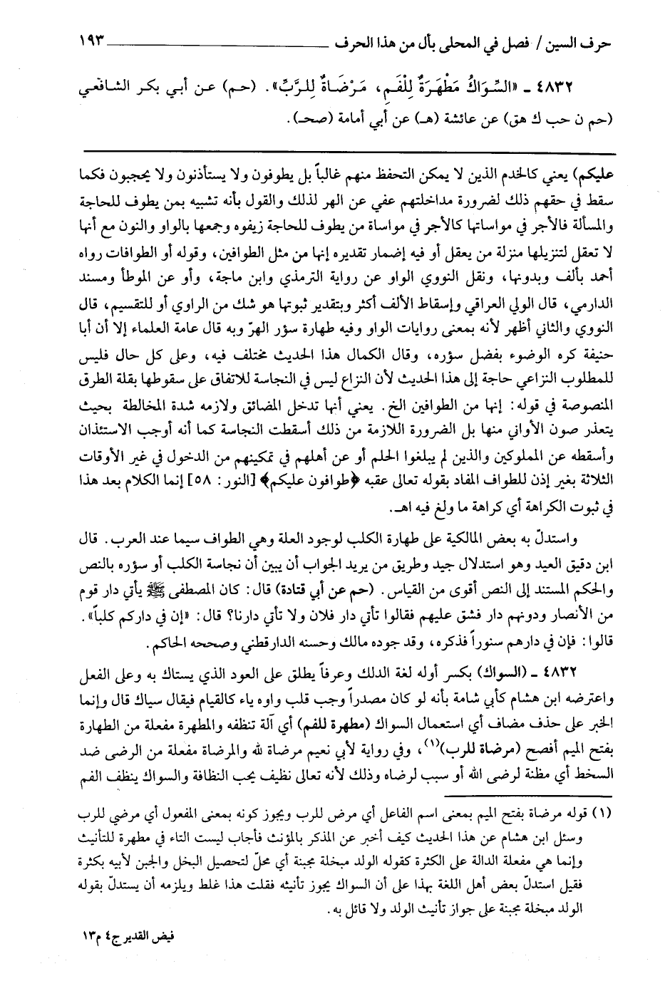 4832 - (السواك) بكسر أوله لغة الدلك وعرفا يطلق على العود الذي يستاك به وعلى الفعل واعترضه ابن هشام كأبي شامة بأنه لو كان مصدرا وجب قلب واوه ياء كالقيام فيقال سياك قال : وإنما الخبر على حذف مضاف أي استعمال السواك (مطهرة للفم) أي آلة تنظفه والمطهرة مفعلة من الطهارة بفتح الميم أفصح (مرضاة للرب (1) وفي رواية لأبي نعيم مرضاة لله والمرضاة مفعلة من الرضى ضد السخط أي مظنة لرضى الله أو سبب لرضاه وذلك لأنه تعالى نظيف يحب النظافة والسواك ينظف الفم