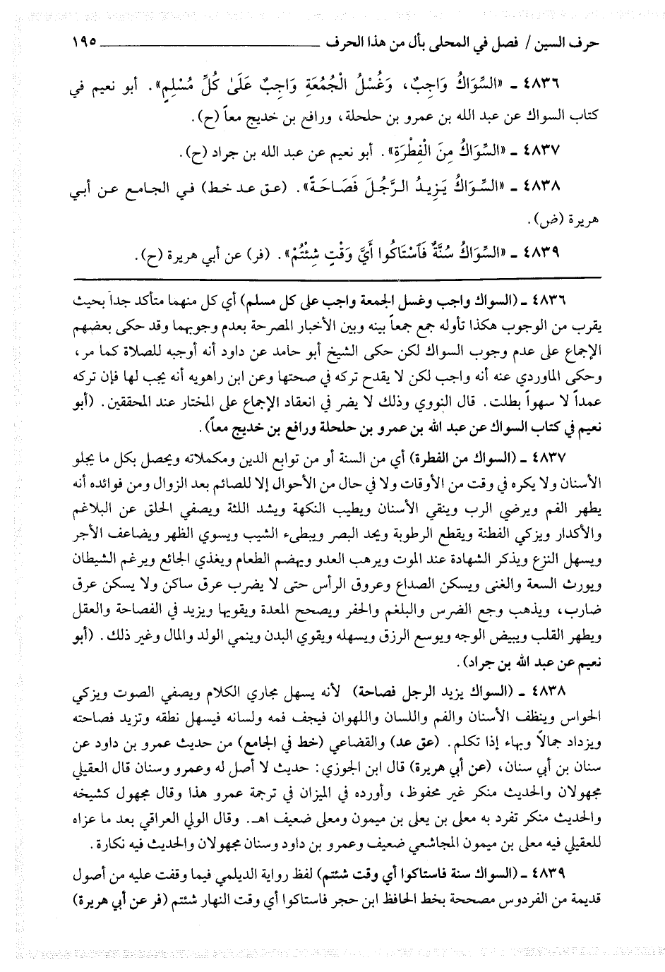 4838 - (السواك يزيد الرجل فصاحة) لأنه يسهل مجاري الكلام ويصفي الصوت ويزكي الحواس وينظف الأسنان والفم واللسان واللهوان فيجف فمه ولسانه فيسهل نطقه وتزيد فصاحته ويزداد جمالا وبهاء إذا تكلم.