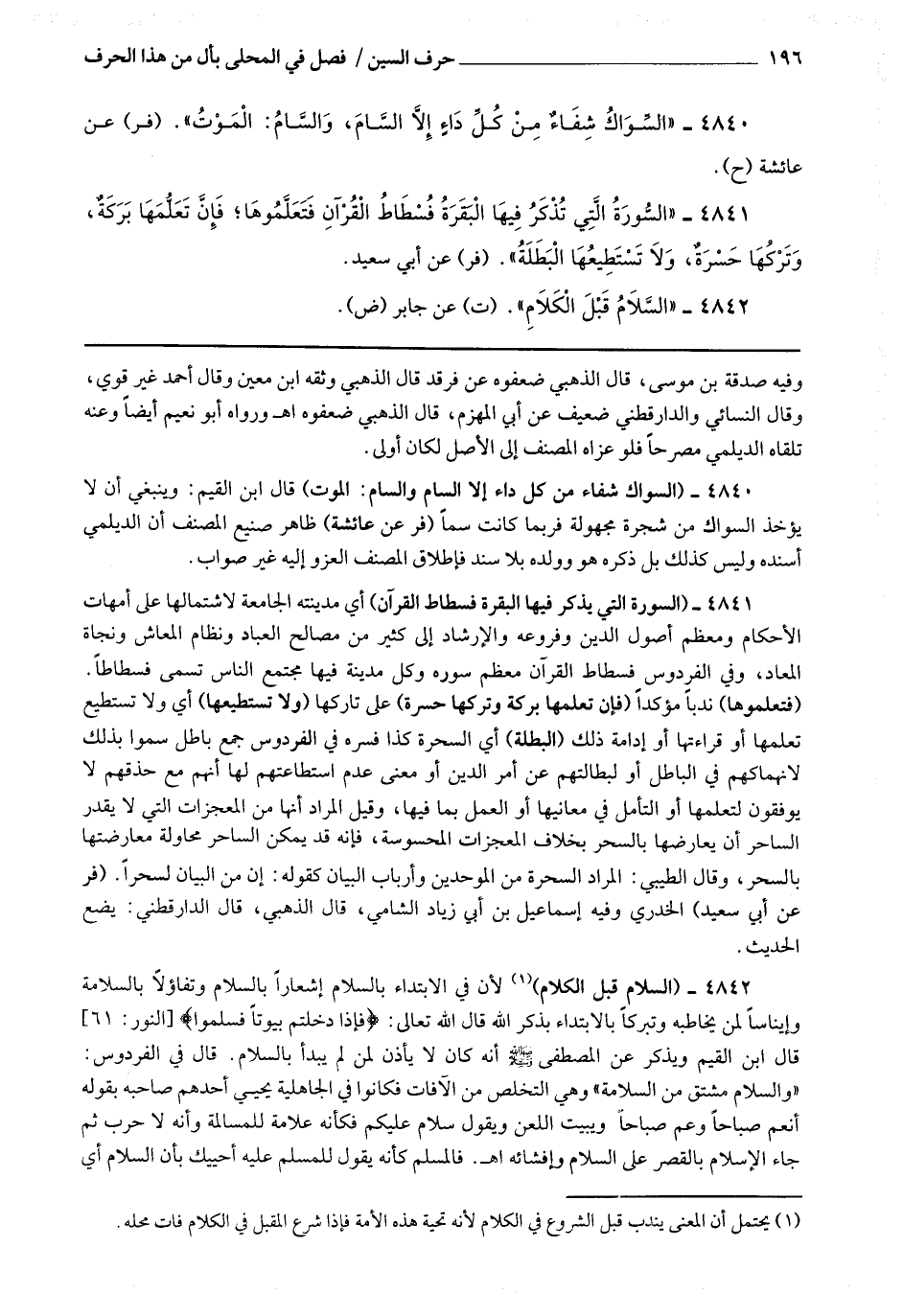 4842 - (السلام قبل الكلام) (1) لأن في الابتداء بالسلام إشعارا بالسلام وتفاؤلا بالسلامة وإيناسا لمن يخاطبه وتبركا بالابتداء بذكر الله قال الله تعالى * (فإذا دخلتم بيوتا فسلموا) * قال ابن القيم : ويذكر عن المصطفى صلى الله عليه وسلم أنه كان لا يأذن لمن لم يبدأ بالسلام قال في الفردوس : والسلام مشتق من السلامة وهي التخلص من الآفات فكانوا في الجاهلية يحيي أحدهم صاحبه بقوله أنعم صباحا وعم صباحا ويبيت اللعن ويقول سلام عليكم فكأنه علامة للمسالمة وأنه لا حرب ثم جاء الإسلام بالقصر على السلام وإفشائه اه فالمسلم كأنه يقول للمسلم عليه أحييك بأن السلام أي