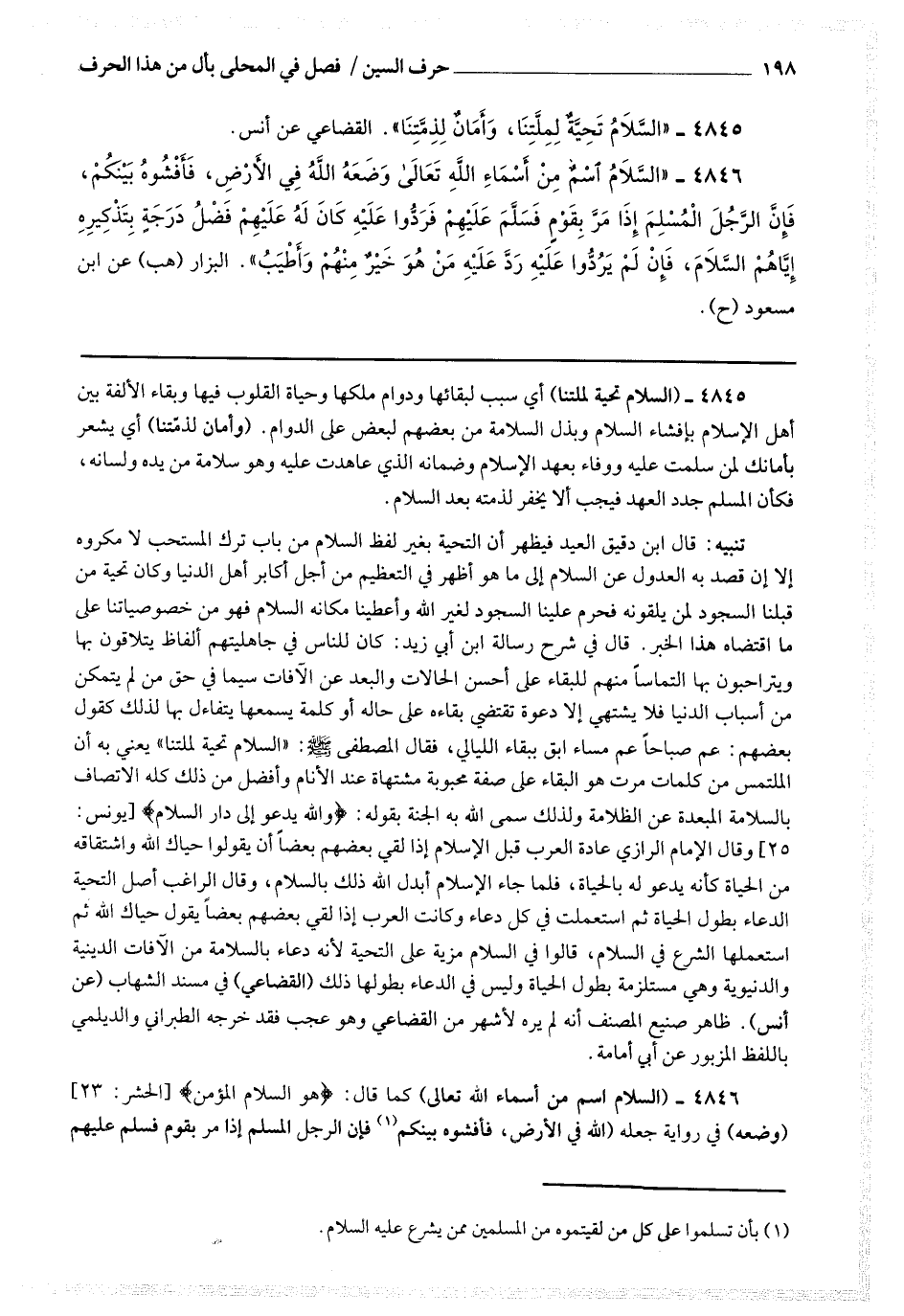 4846 - (السلام اسم من أسماء الله) كما قال * (هو السلام المؤمن) * (وضعه) في رواية جعله (الله في الأرض فأفشوه بينكم (1) فإن الرجل المسلم إذا مر بقوم فسلم عليهم