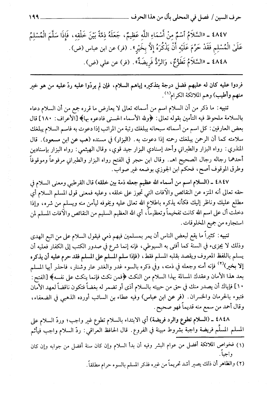 4847 - (السلام اسم من أسماء الله عظيم جعله ذمة بين خلقه) قال القرطبي : ومعنى السلام في حقه تعالى أنه المنزه عن النقائص والآفات التي تجوز على خلقه ، وعليه فمعنى قول المسلم السلام أي مطلع عليك وناظر إليك فكأنه يذكره باطلاع الله تعالى عليه ويخوفه ليأمن منه ويسلم من شره وإذا دخلت أل على اسم الله كانت تفخيما وتعظيما أي الله العظيم السليم من النقائص والآفات المسلم لمن استجاره من جميع المخلوقات.