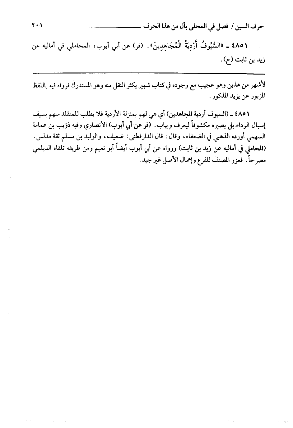 4851 - (السيوف أردية المجاهدين) أي هي لهم بمنزلة الأردية فلا يطلب للمتقلد منهم بسيف إسبال الرداء بل يصيره مكشوفا ليعرف ويهاب.