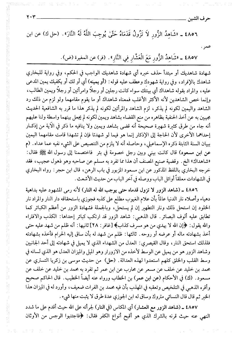 4856 - (شاهد الزور لا تزول قدماه حتى يوجب الله له النار) لأنه رمى المشهود عليه بداهية دهياء وأصلاه نار الدنيا عالما بأن علام الغيوب مطلع على كذبه فجوزي باستحقاقه دار النار والمراد نار الخلود إن استحل ذلك ونار التطهير إن لم يستحل وبالجملة فشهادة الزور من أعظم الكبائر كما تطابق عليه أولو البصائر.