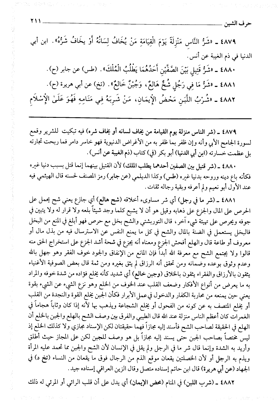 4879 - (شر الناس منزلة يوم القيامة من يخاف لسانه أو يخاف شره) فيه تبكيت للشرير وقمع لسورة الجامح الأبي وأنه وإن ظفر بما ظفر به من الأغراض الدنيوية فهو خاسر دامر فما ربحت تجارته بل عظمت خسارته.