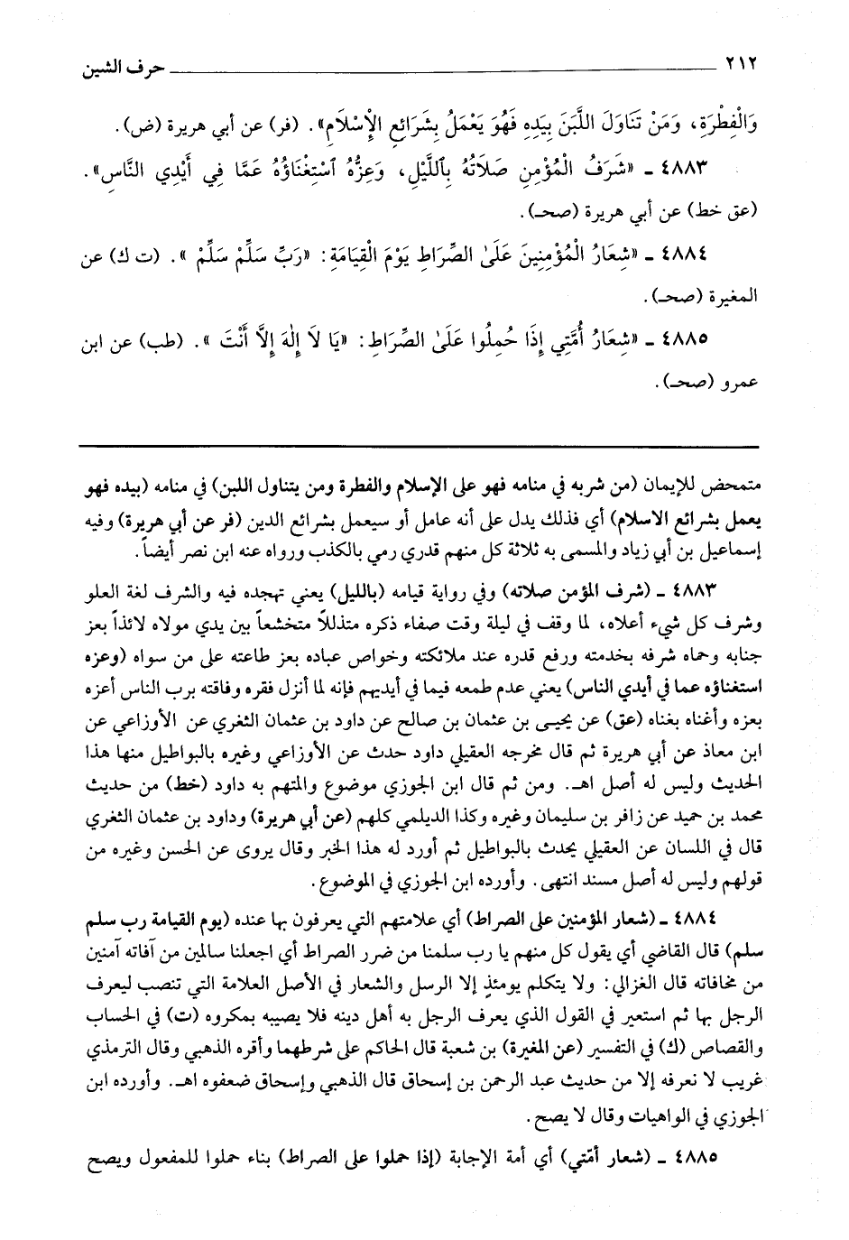 4883 - (شرف المؤمن صلاته) وفي رواية قيامه (بالليل) يعني تهجده فيه والشرف لغة العلو وشرف كل شئ أعلاه ، لما وقف في ليله وقت صفاء ذكره متذللا متخشعا بين يدي مولاه لائذا بعز جنابه وحماه شرفه بخدمته ورفع قدره عند ملائكته وخواص عباده بعز طاعته على من سواه (وعزه استغناؤه عما في أيدي الناس) يعني عدم طمعه فيما في أيديهم فإنه لما أنزل فقره وفاقته برب الناس أعزه بعزه وأغناه بغناه.