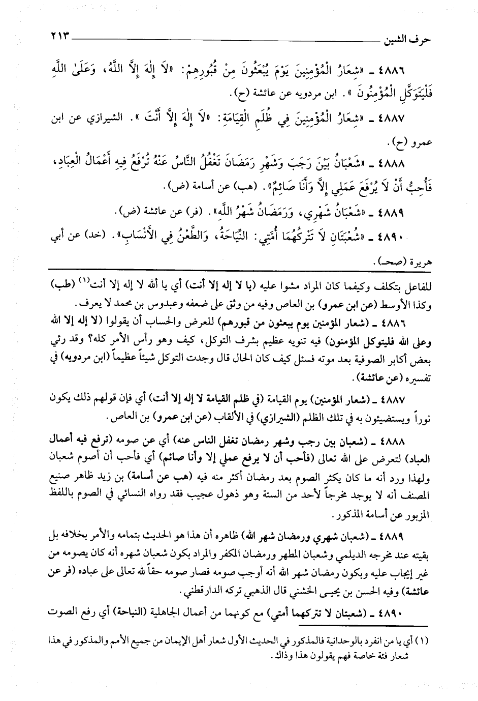 4887 - (شعار المؤمنين) يوم القيامة (في ظلم القيامة لا إله إلا أنت) أي فإن قولهم ذلك يكون نورا ويستضيئون به في تلك الظلم.
