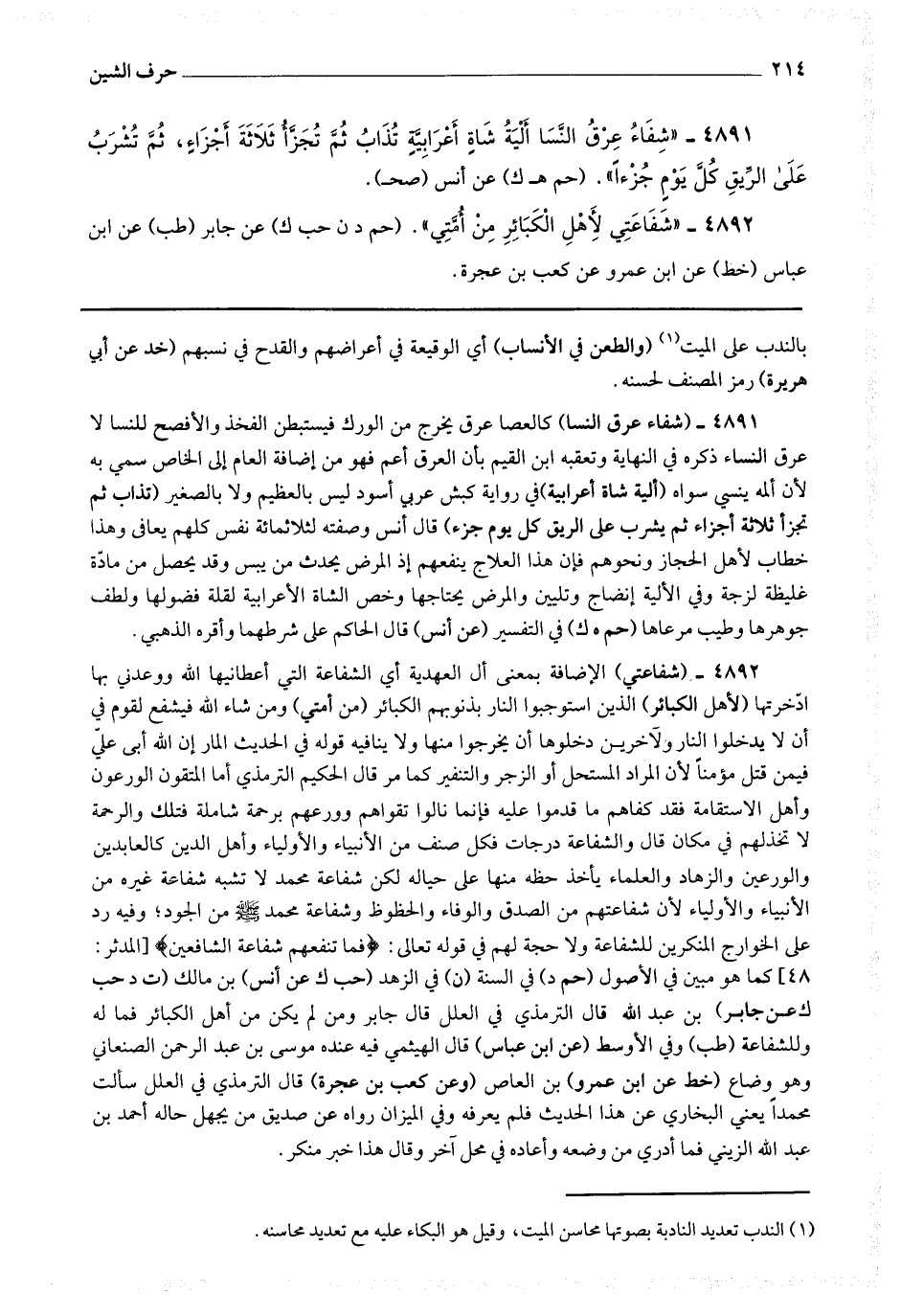 4892 - (شفاعتي) الإضافة بمعنى أل العهدية أي الشفاعة التي أعطانيها الله ووعدني بها ادخرتها (لأهل الكبائر) الذين استوجبوا النار بذنوبهم الكبائر (من أمتي) ومن شاء الله (1) فيشفع لقوم في أن لا يدخلوا النار ولآخرين دخلوها أن يخرجوا منها ولا ينافيه قوله في الحديث المار إن الله أبى علي فيمن قتل مؤمنا لأن المراد المستحل أو الزجر والتنفير كما مر.