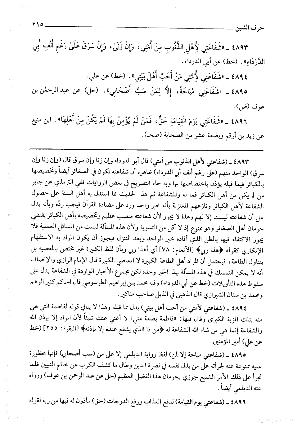 4893 - (شفاعتي لأهل الذنوب من أمتي) قال أبو الدرداء : وإن زنا وإن سرق قال : (وإن زنا وإن سرق) الواحد منهم (على رغم أنف أبي الدرداء) ظاهره أن شفاعته تكون في الصغائر أيضا وتخصيصها بالكبائر فيما قبله يؤذن باختصاصها بها وبه جاء التصريح في بعض الروايات ففي الترمذي عن جابر