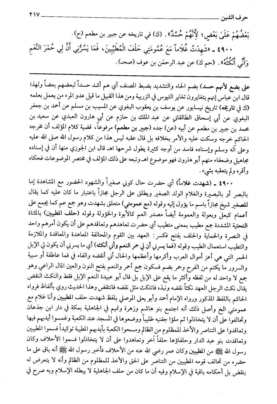 4900 - (شهدت غلاما) أي حضرت حيال كوني صغيرا والشهود الحضور مع المشاهدة إما بالبصر أو بالبصيرة والغلام الولد الصغير ويطلق على الرجل مجازا باعتبار ما كان عليه كما يقال للصغير شيخ مجازا باسم ما يؤول إليه وقوله (مع عمومتي) متعلق بشهدت وهو جمع عم كما يجمع على أعمام كبعل وبعولة والعمومة أيضا مصدر العم كالأبوة والخؤولة وقوله (حلف المطيبين) بالمثناة التحتية المشددة جمع مطيب بمعنى متطيب أي حضرت تعاهدهم وتعاقدهم على أن يكون أمرهم واحد في النصرة والحماية والحلف بفتح فكسر : العهد بين القوم والمحالفة المعاهدة والمعاقدة والملازمة والتطيب استعمال الطيب وقوله (فما يسرني أن لي حمر النعم وأني أنكثه) أي ما يسرني أن يكون لي الإبل الحمر التي هي أعز أموال العرب وأكرمها وأعظمها والحال أني أنقضه والفاء في فما عاطفة أو سببية والسرور ما يكتم من الفرح وحمر بضم فسكون جمع أحمر والنعم بفتح النون والعين المال الراعي وهو جمع لا واحد له من لفظه وأكثر ما يقع على الإبل بل قال أبو عبيدة : النعم الإبل فقط والنكث النقض يقال نكث الرجل العهد نكثا نقضه ونبذه فانتكث مثل نقضه فانتقض وهذا الحديث روي بألفاظ فرواه