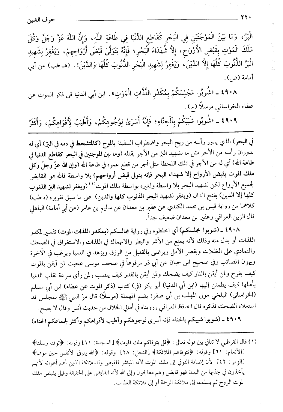 4908 - (شوبوا مجلسكم) أي اخلطوه وفي رواية مجالسكم (بمكدر اللذات الموت) تفسير لمكدر اللذات أو بدل منه وذلك لأنه يمنع من الأشر والبطر والانهماك في اللذات والاستغراق في الضحك والتمادي على الغفلات ويقصر الأمل ويرضي بالقليل من الرزق ويزهد في الدنيا ويرغب في الآخرة ويهون المصائب وفي صحيح ابن حبان عن أبي ذر مرفوعا في صحف موسى عجبت لمن أيقن بالموت