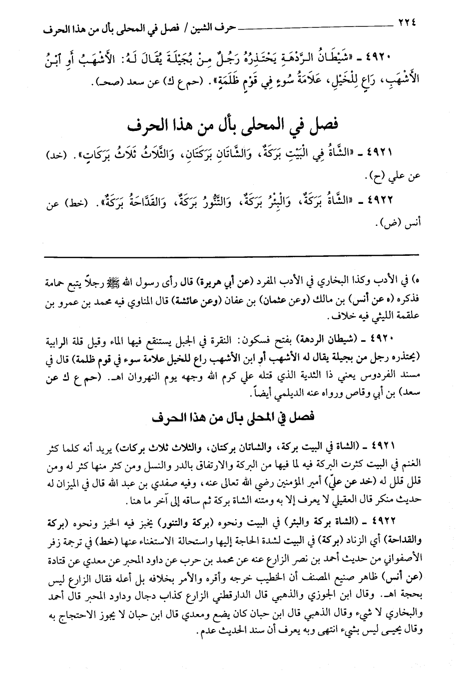 4920 - (شيطان الردهة) بفتح فسكون: النفرة في الجبل يستنقع فيها الماء وقيل قلة الرابية (يحتذره رجل من بجيلة يقال له الأشهب أو ابن الأشهب راع للخيل علامة سوء في قوم ظلمة) قال في مسند الفردوس: يعني ذا الثدية الذي قتله علي كرم الله وجهه يوم النهروان اه.