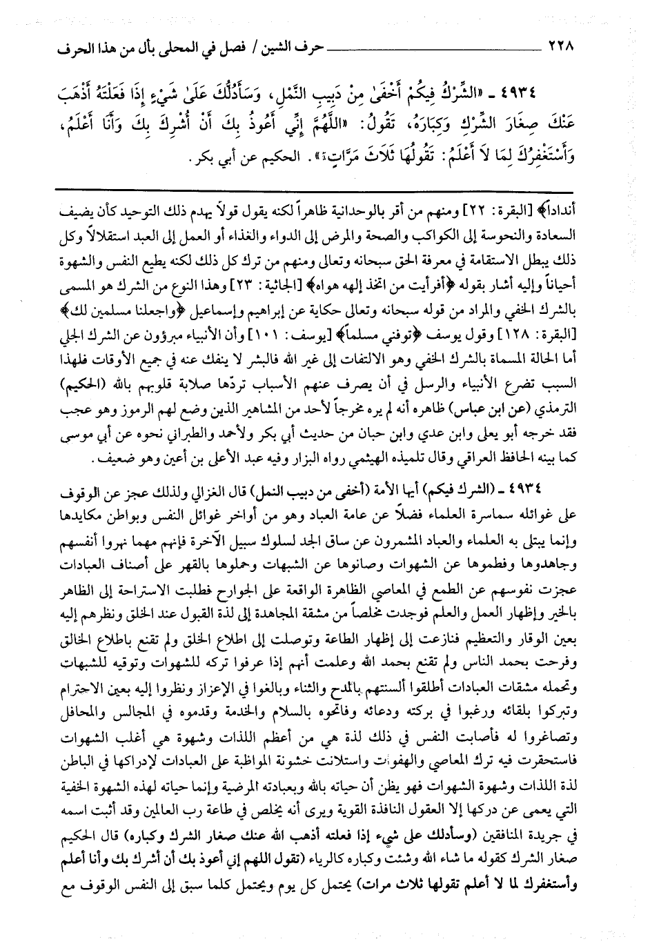 4934 - (الشرك فيكم) أيها الأمة (أخفى من دبيب النمل) قال الغزالي : ولذلك عجز عن الوقوف على غوائله سماسرة العلماء فضلا عن عامة العباد وهو من أواخر غوائل النفس وبواطن مكايدها وإنما يبتلى به العلماء والعباد المشمرون عن ساق الجد لسلوك سبيل الآخرة فإنهم مهما نهروا أنفسهم وجاهدوها وفطموها عن الشهوات وصانوها عن الشبهات وحملوها بالقهر على أصناف العبادات عجزت نفوسهم عن الطمع في المعاصي الظاهرة الواقعة على الجوارح فطلبت الاستراحة إلى الظاهر بالخير وإظهار العمل والعلم فوجدت مخلصا من مشقة المجاهدة إلى لذة القبول عند الخلق ونظرهم إليه بعين الوقار والتعظيم فنازعت إلى إظهار الطاعة وتوصلت إلى إطلاع الخلف ولم تقنع بإطلاع الخالق وفرحت بحمد الناس ولم تقنع بحمد الله وعلمت أنهم إذا عرفوا تركه للشهوات وتوقيه للشبهات وتحمله مشقات العبادات أطلقوا ألسنتهم بالمدح والثناء وبالغوا في الإعزاز ونظروا إليه بعين الاحترام وتبركوا بلقائه ورغبوا في بركته ودعائه وفاتحوه بالسلام والخدمة وقدموه في المجالس والمحافل وتصاغروا له فأصابت النفس في ذلك لذة هي من أعظم اللذات وشهوة هي أغلب الشهوات فاستحقرت فيه ترك المعاصي والهفوات واستلانت خشونة المواظبة على العبادات لإدراكها في الباطن لذة اللذات وشهوة الشهوات فهو يظن أن حياته بالله وبعبادته المرضية وإنما حياته لهذه الشهوة الخفية التي يعمى عن دركها إلا العقول النافذة القوية ويرى أنه يخلص في طاعة رب العالمين وقد أثبت اسمه في جريدة المنافقين (وسأدلك على شئ إذا فعلته أذهب الله عنك صغار الشرك وكباره) قال الحكيم : صغار الشرك كقوله ما شاء الله وشئت وكباره كالرياء (تقول اللهم إني أعوذ بك أن أشرك بك وأنا أعلم وأستغفرك لما لا أعلم تقولها ثلاث مرات) يحتمل كل يوم ويحتمل كلما سبق إلى النفس الوقوف مع