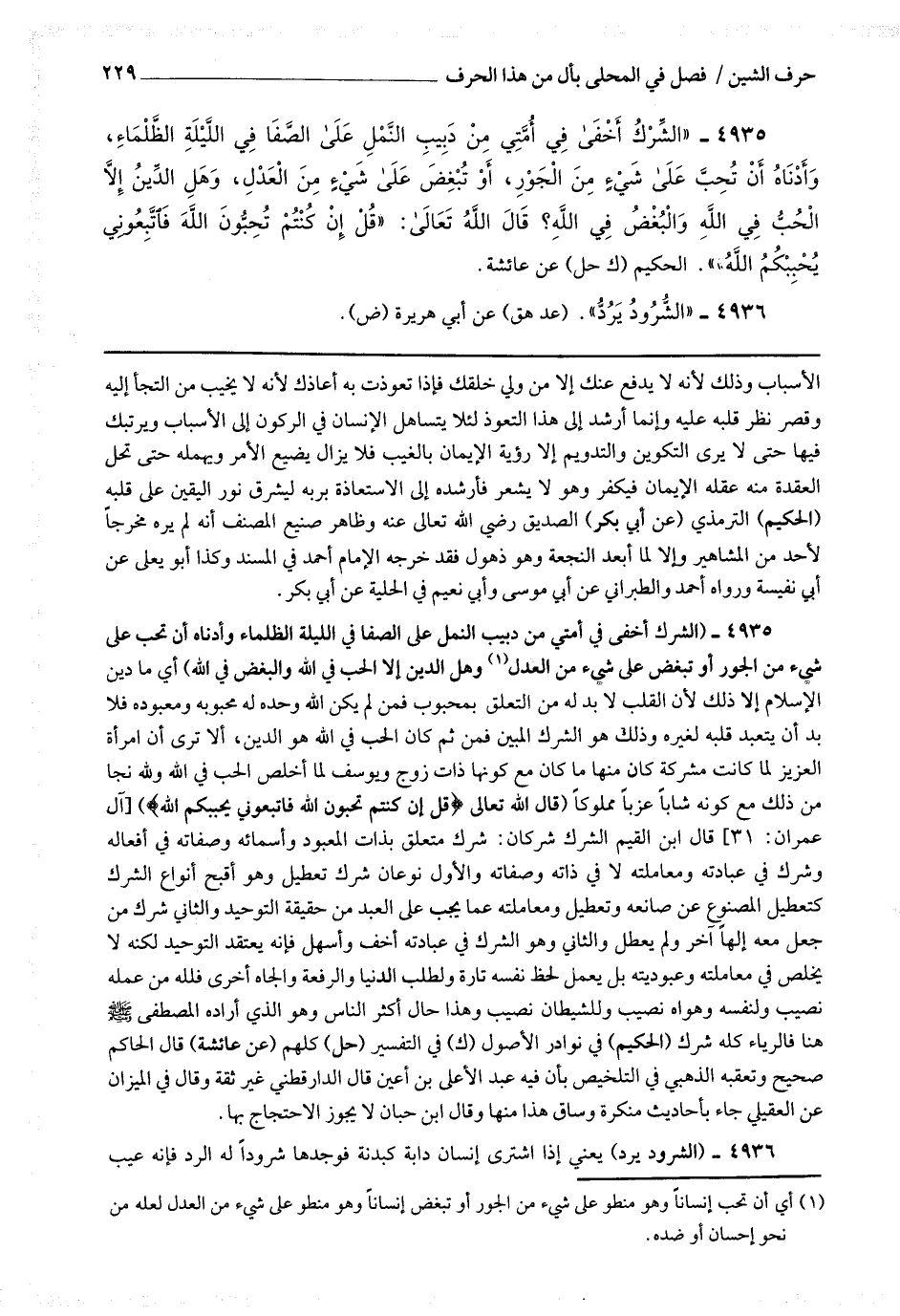 4935 - (الشرك أخفى في أمتي من دبيب النمل على الصفا في الليلة الظلماء وأدناه أن تحب على شئ من الجور أو تبغض على شئ من العدل (1) وهل الدين إلا الحب في الله والبغض في الله) أي ما دين الإسلام إلا ذلك لأن القلب لا بد له من التعليق بمحبوب فمن لم يكن الله وحده له محبوبه ومعبوده فلا بد أن يتعبد قلبه لغيره وذلك هو الشرك المبين فمن ثم كان الحب في الله هو الدين ، ألا ترى أن امرأة العزيز لما كانت مشركة كان منها ما كان مع كونها ذات زوج ويوسف لما أخلص الحب في الله ولله نجا من ذلك مع كونه شابا عزبا مملوكا (قال الله تعالى * (قل إن كنتم تحبون الله فاتبعوني يحببكم الله) *) قال ابن القيم : الشرك شركان : شرك متعلق بذات المعبود وأسمائه وصفاته في أفعاله وشرك في عبادته ومعاملته لا في ذاته وصفاته والأول نوعان شرك تعطيل وهو أقبح أنواع الشرك كتعطيل المصنوع عن صانعه وتعطيل معاملته عما يجب على العبد من حقيقة التوحيد والثاني شرك من جعل معه إلها آخر ولم يعطل والثاني وهو الشرك في عبادته أخف وأسهل فإنه يعتقد التوحيد لكنه لا يخلص في معاملته وعبوديته بل يعمل لحظ نفسه تارة ولطلب الدنيا والرفعة والجاه أخرى فلله من عمله نصيب ولنفسه وهواه نصيب وللشيطان نصيب وهذا حال أكثر الناس وهو الذي أراده المصطفى صلى الله عليه وسلم هنا فالرياء كله شرك.