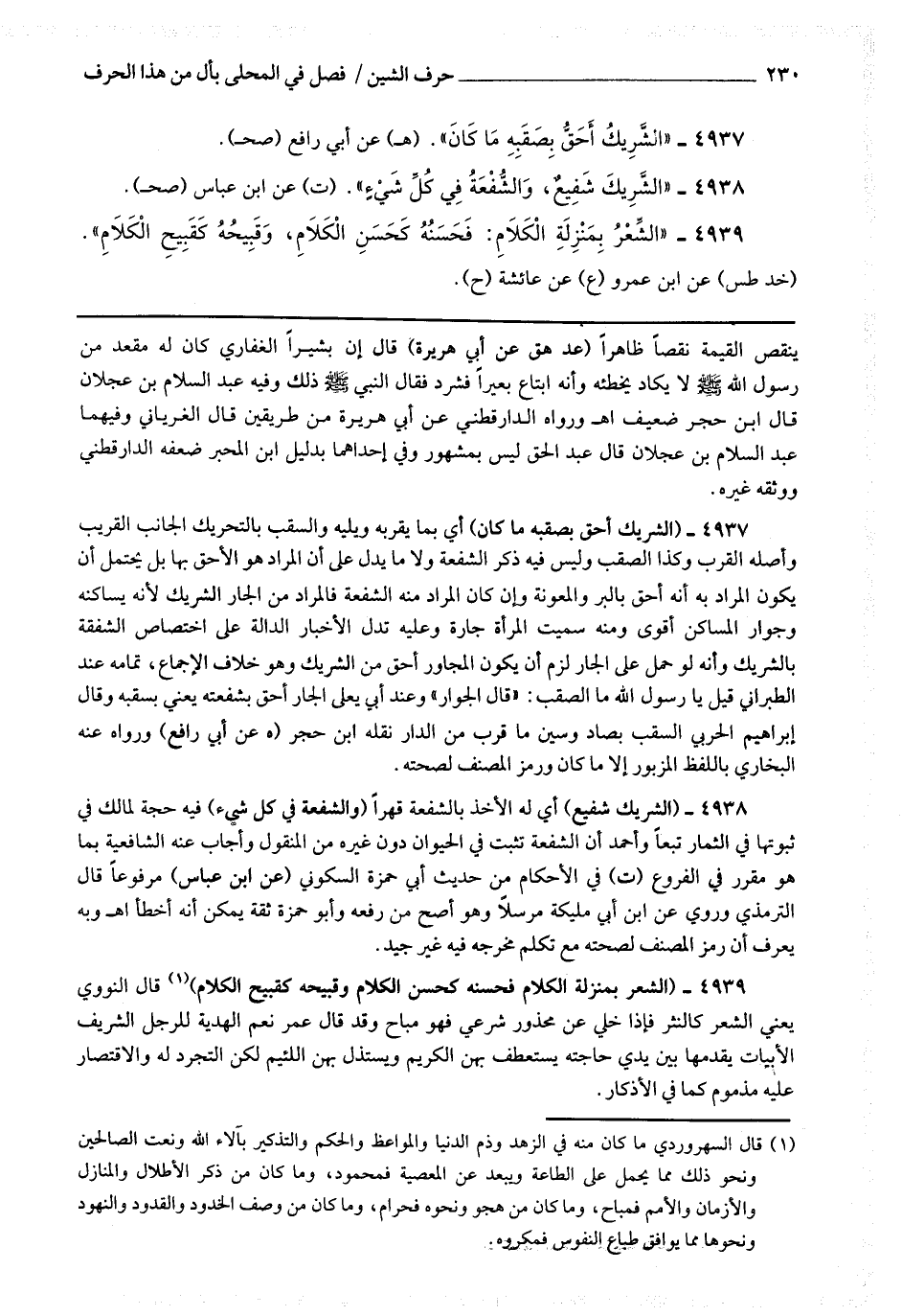 4938 - (الشريك شفيع) أي له الأخذ بالشفعة قهرا (والشفعة في كل شئ) فيه حجة لمالك في ثبوتها في الثمار تبعا وأحمد أن الشفعة تثبت في الحيوان دون غيره من المنقول وأجاب عنه الشافعية بما هو مقرر في الفروع.