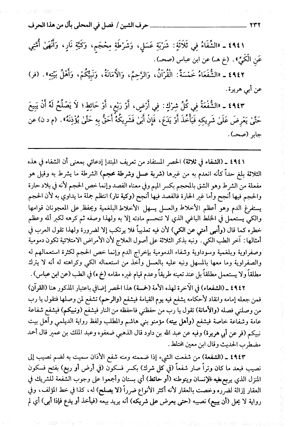 4943 - (الشفعة) من شفعت الشئ إذا ضممته ومنه شفع الأذان سميت به لضم نصيب إلى نصيب فبعد ما كان وترا صار شفعا (في كل شرك) بكسر فسكون (في أرض أو ريع) بفتح فسكون