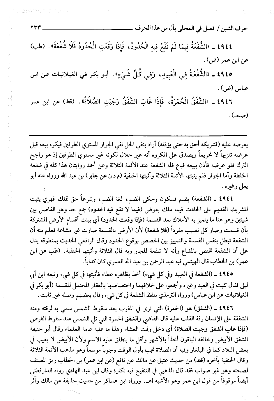 4944 - (الشفعة) بضم فسكون وحكي الضم ، لغة الضم ، وشرعا حق تملك قهري يثبت للشريك القديم على الحادث فيما ملك بعوض (فيما لا تقع فيه الحدود) جمع حد وهو الفاصل بين شيئين وهو هنا ما يتميز به الأملاك بعد القسمة (فإذا وقعت الحدود) أي بينت أقسام الأرض المشتركة بأن قسمت وصار كل نصيب مفردا (فلا شفعة) لأن الأرض بالقسمة صارت غير مشاعة فعلم منه أن الشفعة تبطل بنفس القسمة والتمييز بين الحصص بوقوع الحدود وقال الرافعي : الحديث بمنطوقه يدل على أن الشفعة تختص بالمشاع وأنه لا شفعة للجار وبه قال الثلاثة وأثبتها الحنفية.