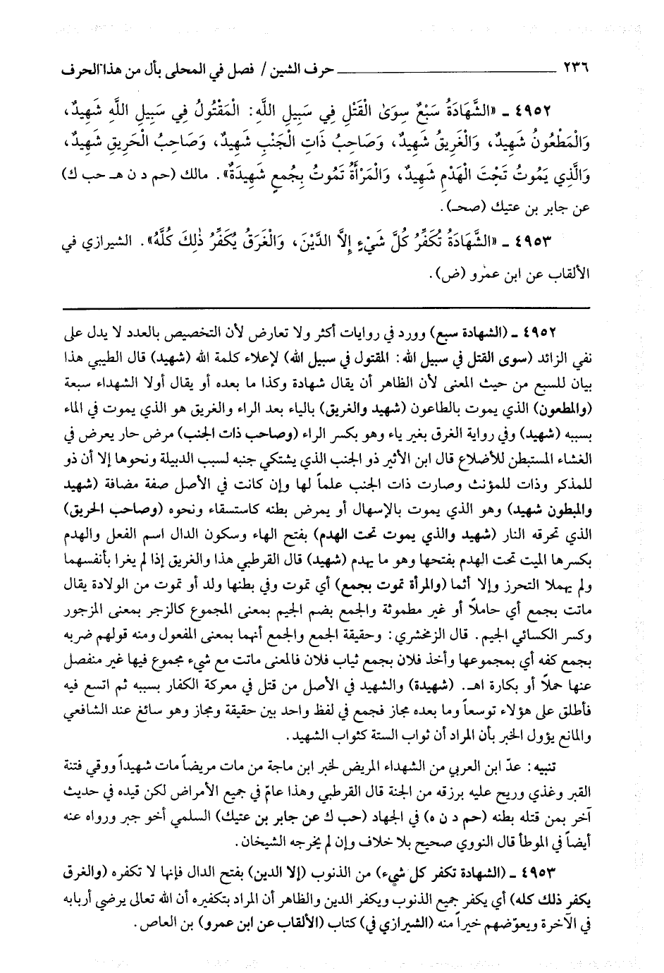 4952 - (الشهادة سبع) وورد في روايات أكثر ولا تعارض لأن التخصيص بالعدد لا يدل على نفي الزائد (سوى القتل في سبيل الله : المقتول في سبيل الله) لإعلاء كلمة الله (شهيد) قال الطيبي : هذا بيان للسبع من حيث المعنى لأن الظاهر أن يقال شهادة وكذا ما بعده أو يقال أولا الشهداء سبعة (والمطعون) الذي يموت بالطاعون (شهيد والغريق) بالياء بعد الراء والغريق هو الذي يموت في الماء بسببه (شهيد) وفي رواية الغرق بغير ياء وهو بكسر الراء (وصاحب ذات الجنب) مرض حار يعرض في الغشاء المستبطن للأضلاع قال ابن الأثير : ذو الجنب الذي يشتكي جنبه لسبب الدبيلة ونحوها إلا أن ذو للمذكر وذات للمؤنث وصارت ذات الجنب علما لها وإن كانت في الأصل صفة مضافة (شهيد والمبطون شهيد) وهو الذي يموت بالإسهال أو يمرض بطنه كاستسقاء ونحوه (وصاحب الحريق)