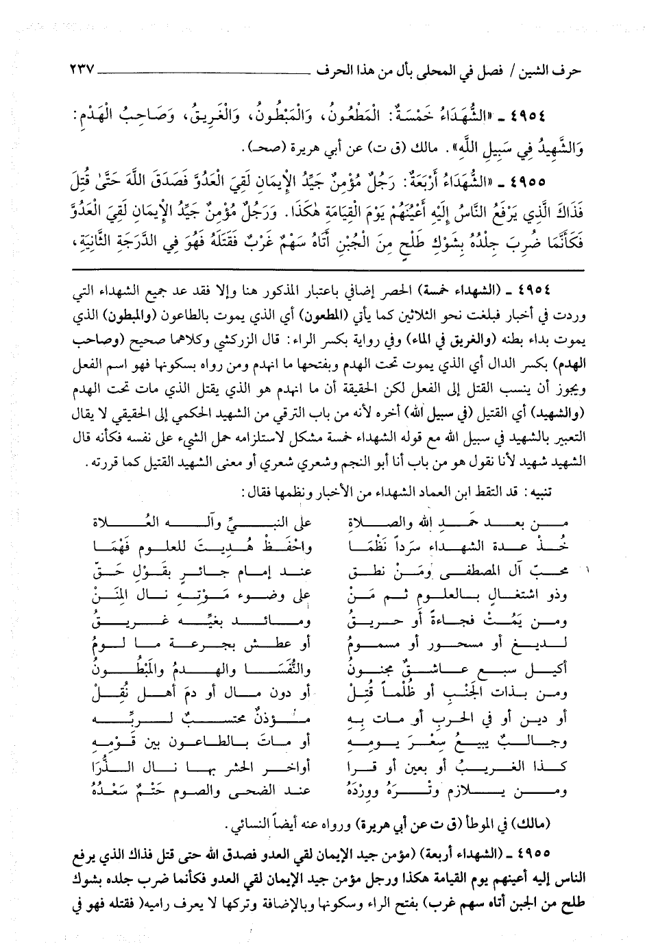 (تنبيه) قد التقط ابن العماد الشهداء من الأخبار ونظمها فقال : من بعد حمد الله والصلاة * على النبي وآله العلاة خذ عدة الشهداء سردا نظما * واحفظ هديت للعلوم فهما محب آل المصطفى ومن نطق * عند إمام جائر يقول حق وذو اشتغال بالعلوم ثم من * على وضوء موته نال المنن ومن يمت فجاءة أو حريق * ومائد بغيه غريق لديغ أو مسحور أو مسموم * أو عطش بجرعة ما لوم أكيل سبع عاشق مجنون * والنفسا والهدم والمبطون ومن بذات الجنب أو ظلما قتل * أو دون مال أو دم أهل نقل أو دين أو في الحرب أو مات به * مؤذن محتسب لربه وجالب يبيع سعر يومه * أو مات بالطاعون بين قومه كذا الغريب أو بعين أو قرا * أواخر الحشر بها نال الذرا ومن يلازم وتره وورده * عند الضحى والصوم حتم سعده (مالك) في الموطأ (ق ت عن أبي هريرة) ورواه عنه النسائي.