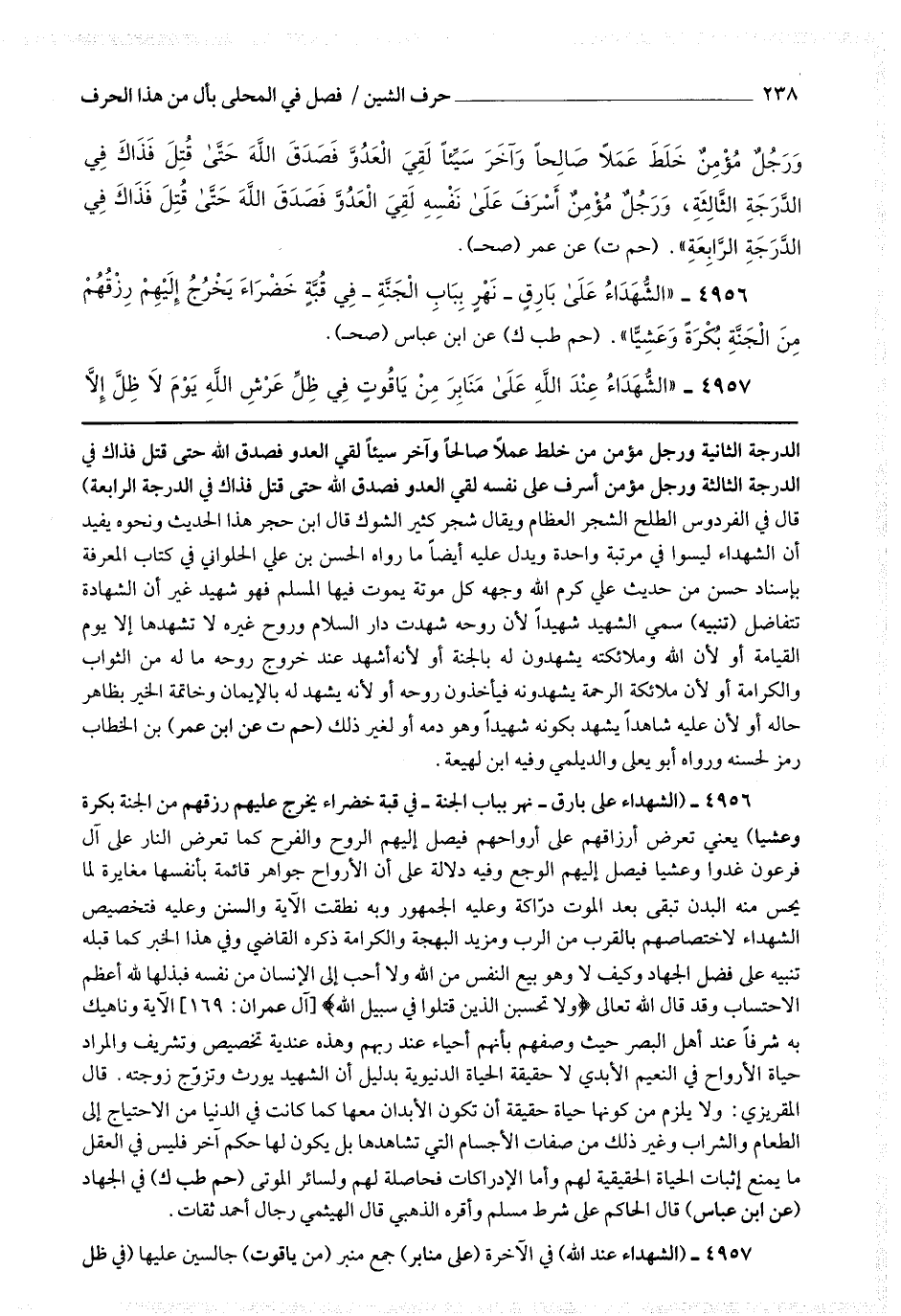 الدرجة الثانية ورجل مؤمن خلط عملا صالحا وآخر سيئا لقي العدو فصدق الله حتى قتل فذاك في الدرجة الثالثة ورجل مؤمن أسرف على نفسه لقي العدو فصدق الله حتى قتل فذاك في الدرجة الرابعة) قال في الفردوس : الطلح الشجر العظام ويقال شجر كثير الشوك قال ابن حجر : هذا الحديث ونحوه يفيد أن الشهداء ليسوا في مرتبة واحدة ويدل عليه أيضا ما رواه الحسن بن علي الحلواني في كتاب المعرفة بإسناد حسن من حديث علي كرم الله وجهه كل موتة يموت فيها المسلم فهو شهيد غير أن الشهادة تتفاضل (تنبيه) سمي الشهيد شهيدا لأن روحه شهدت دار السلام وروح غيره لا تشهدها إلا يوم القيامة أو لأن الله وملائكته يشهدون له بالجنة أو لأنه أشهد عند خروج روحه ماله من الثواب والكرامة أو لأن ملائكة الرحمة يشهدونه فيأخذون روحه أو لأنه يشهد له بالإيمان وخاتمة الخير بظاهر حاله أو لأن عليه شاهدا يشهد بكونه شهيدا وهو دمه أو لغير ذلك.