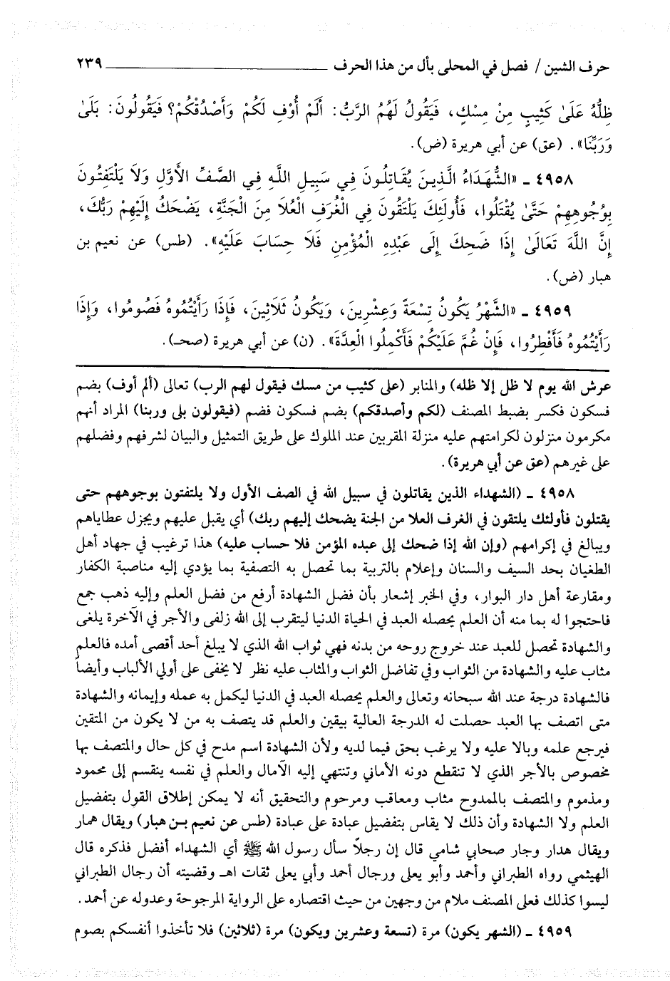 4958 - (الشهداء الذين يقاتلون في سبيل الله في الصف الأول ولا يلتفتون بوجوههم حتى يقتلون فأولئك يلتقون في الغرف العلى من الجنة يضحك إليهم ربك) أي يقبل عليهم ويجزل عطاياهم ويبالغ في إكرامهم (وإن الله إذا ضحك إلى عبده المؤمن فلا حساب عليه) هذا ترغيب في جهاد أهل الطغيان بحد السيف والسنان وإعلام بالتربية بما تحصل به التصفية بما يؤدي إلى مناصبة الكفار ومقارعة أهل دار البوار ، وفي الخبر إشعار بأن فضل الشهادة أرفع من فضل العلم وإليه ذهب جمع فاحتجوا له بما منه أن العلم يحصله العبد في الحياة الدنيا ليتقرب إلى الله زلفى والأجر في الآخرة يلغى والشهادة تحصل للعبد عند خروج روحه من بدنه فهي ثواب الله الذي لا يبلغ أحد أقصى أمده فالعلم مثاب عليه والشهادة من الثواب وفي تفاضل الثواب والمثاب عليه نظر لا يخفى على أولي الألباب وأيضا فالشهادة درجة عند الله سبحانه وتعالى والعلم يحصله العبد في الدنيا ليكمل به عمله وإيمانه والشهادة متى اتصف بها العبد حصلت له الدرجة العالية بيقين والعلم قد يتصف به من لا يكون من المتقين فيرجع علمه وبالا عليه ولا يرغب بحق فيما لديه لأن الشهادة اسم مدح في كل حال والمتصف بها مخصوص بالأجر الذي لا تنقطع دونه الأماني وتنتهي إليه الآمال والعلم في نفسه ينقسم إلى محمود ومذموم والمتصف بالممدوح مثاب ومعاقب ومرحوم والتحقيق أنه لا يمكن إطلاق القول بتفضيل العلم ولا الشهادة وأن ذلك لا يقاس بتفضيل عبادة على عبادة.