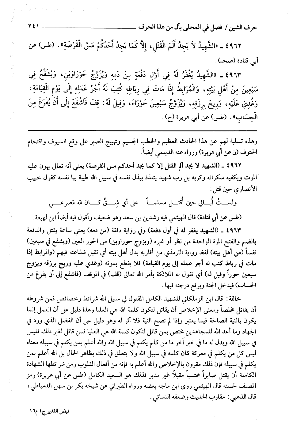 4962 - (الشهيد لا يجد ألم القتل إلا كما يجد أحدكم مس القرصة) يعني أنه تعالى يهون عليه الموت ويكفيه سكراته وكربه بل رب شهيد يتلذذ ببذل نفسه في سبيل الله طيبة بها نفسه كقول خبيب الأنصاري حين قتل : ولست أبالي حين أقتل مسلما * علي أي شق كان لله مصرعي (طس عن أبي قتادة) قال الهيثمي : فيه رشدين بن سعد وهو ضعيف وأقول : فيه أيضا ابن لهيعة.