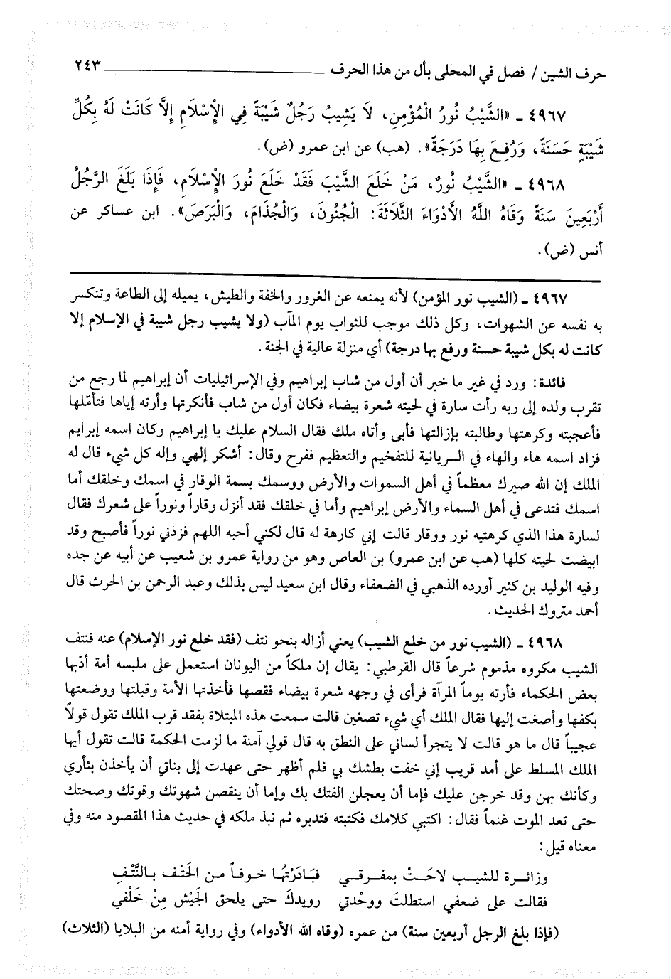 4967 - (الشيب نور المؤمن) لأنه يمنعه عن الغرور والخفة والطيش ويميله إلى الطاعة وتنكسر به نفسه عن الشهوات وكل ذلك موجب للثواب يوم المآب (لا يشيب رجل شيبة في الإسلام إلا كانت له بكل شيبة حسنة ورفع بها درجة) أي منزلة عالية في الجنة (فائدة) ورد في غير ما خبر أن أول من شاب إبراهيم وفي الإسرائيليات أن إبراهيم لما رجع من تقرب ولده إلى ربه رأت سارة في لحيته شعرة بيضاء فكان أول من شاب فأنكرتها وأرته إياها فتأملها فأعجبته وكرهتها وطالبته بإزالتها فأبى وأتاه ملك فقال : السلام عليك يا إبراهيم وكان اسمه ابرايم فزاد اسمه هاء والهاء في السريانية للتفخيم والتعظيم ففرح وقال : أشكر إلهي وإله كل شئ قال له الملك : إن الله صيرك معظما في أهل السماوات والأرض ووسمك بسمة الوقار في اسمك وخلقك أما اسمك فتدعى في أهل السماء والأرض إبراهيم وأما في خلقك فقد أنزل وقارا ونورا على شعرك فقال لسارة : هذا الذي كرهتيه نور ووقار قالت : إني كارهة له قال : لكني أحبه اللهم فزدني نورا فأصبح وقد ابيضت لحيته كلها.