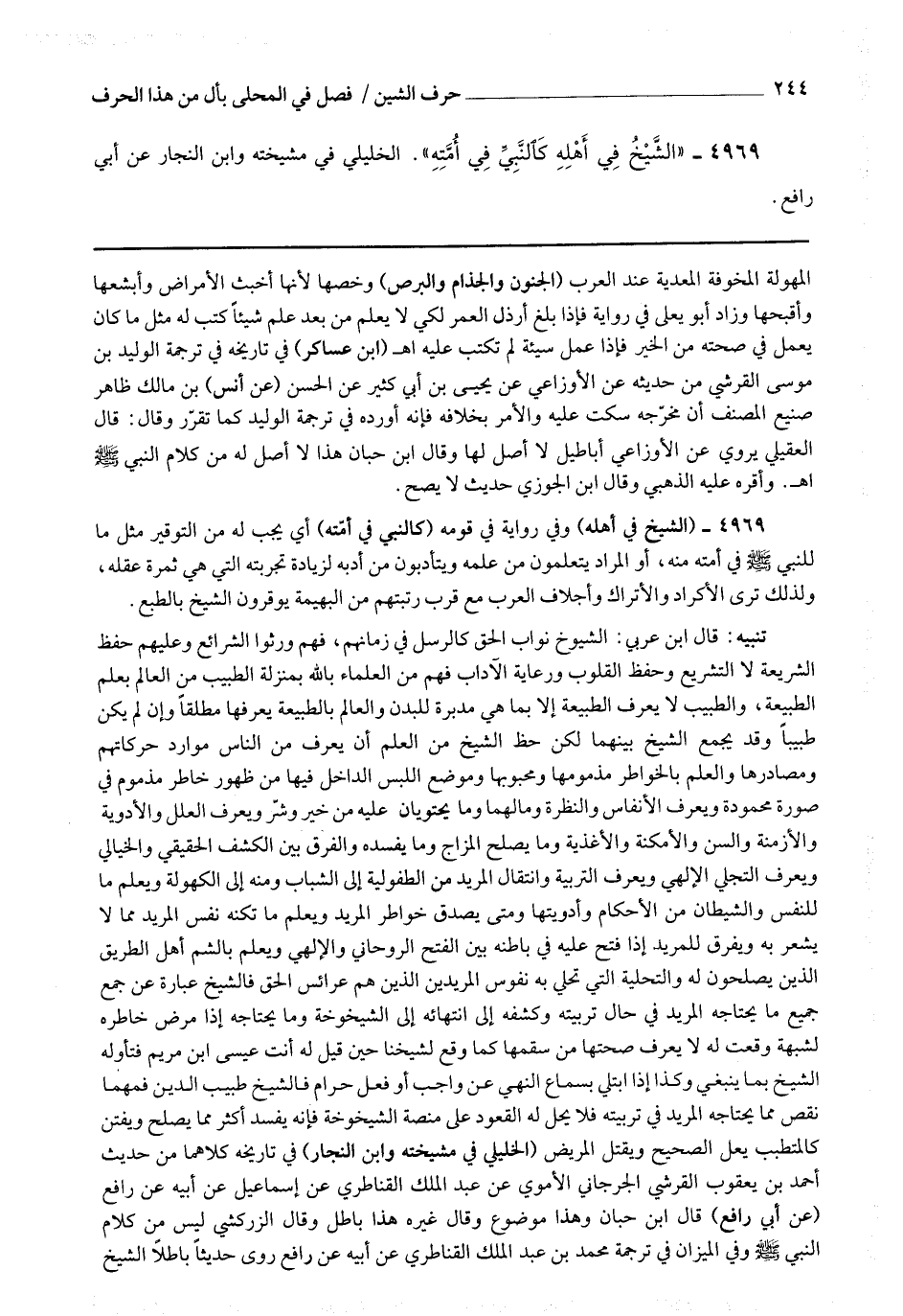 (الخليلي في مشيخته وابن النجار) في تاريخه كلاهما من حديث أحمد بن يعقوب القرشي الجرجاني الأموي عن عبد الملك القناطري عن إسماعيل عن أبيه عن رافع (عن أبي رافع) قال ابن حبان : وهذا موضوع وقال غيره : هذا باطل وقال الزركشي : ليس من كلام النبي صلى الله عليه وسلم وفي الميزان في ترجمة محمد بن عبد الملك القناطري عن أبيه عن رافع روى حديثا باطلا " الشيخ