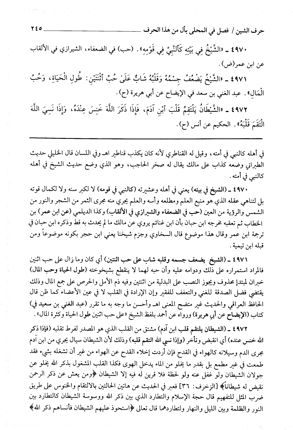 4970 - (الشيخ في بيته) يعني في أهله وعشيرته (كالنبي في قومه) لا لكبر سنه ولا لكمال قوته بل لتناهي عقله الذي هو منبع العلم ومطلعه وأسه والعلم يجري منه مجرى الثمر من الشجر والنور من الشمس والرؤية من العين.