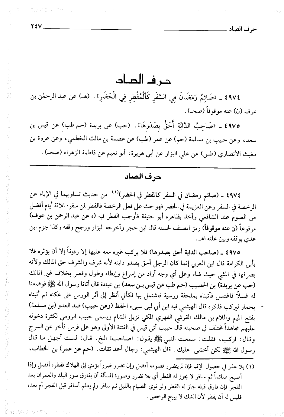 4974 - (صائم رمضان في السفر كالمفطر في الحضر) (1) من حيث تساويهما في الإباء عن الرخصة في السفر وعن العزيمة في الحضر فهو حث على فعل الرخصة فالفطر لمن سفره ثلاثة أيام أفضل من الصوم عند الشافعي وأخذ بظاهره أبو حنيفة فأوجب الفطر فيه.