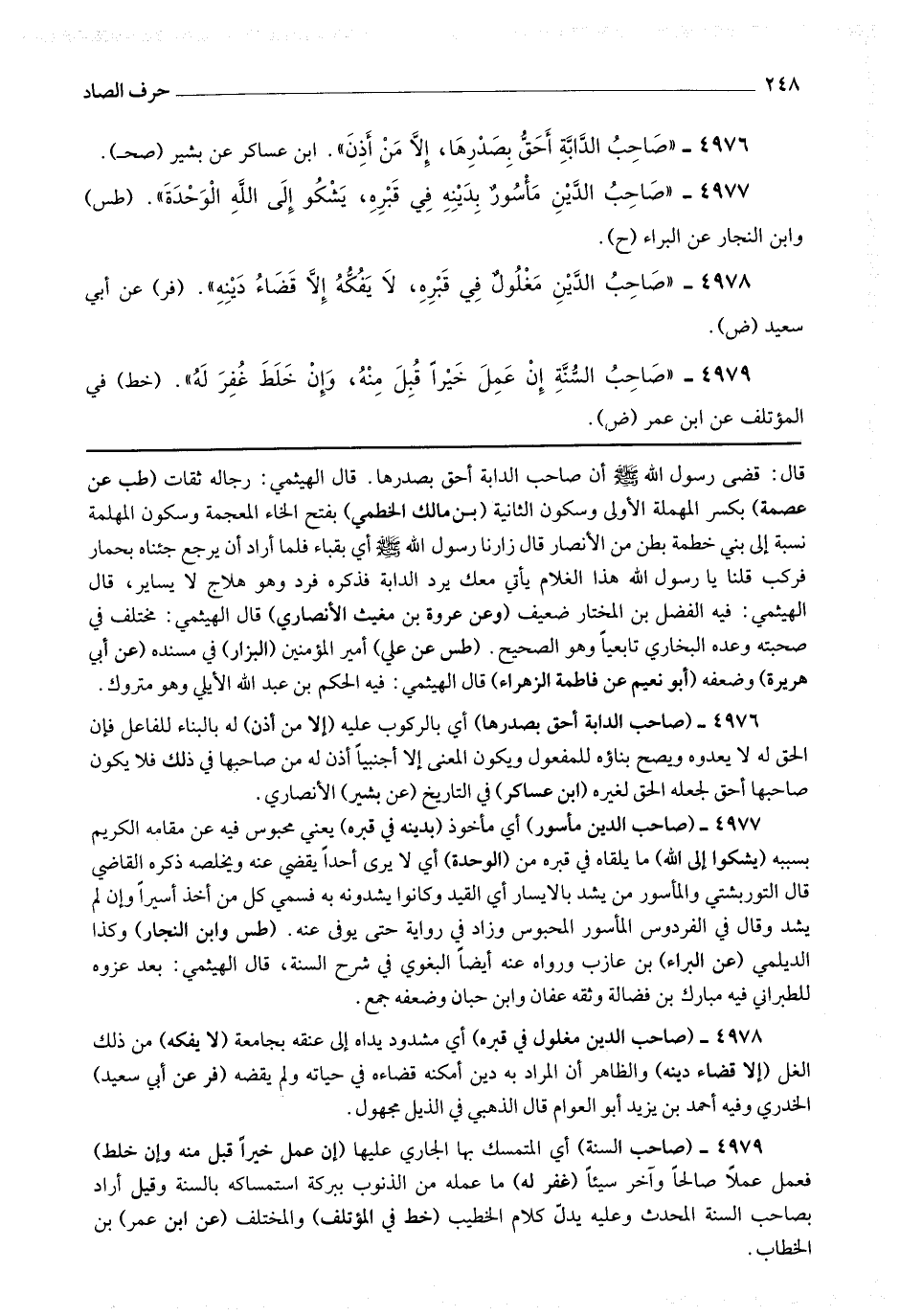 4978 - (صاحب الدين مغلول في قبره) أي مشدود يداه إلى عنقه بجامعة (لا يفكه) من ذلك الغل (إلا قضاء دينه) والظاهر أن المراد به دين أمكنه قضاءه في حياته ولم يقضه.