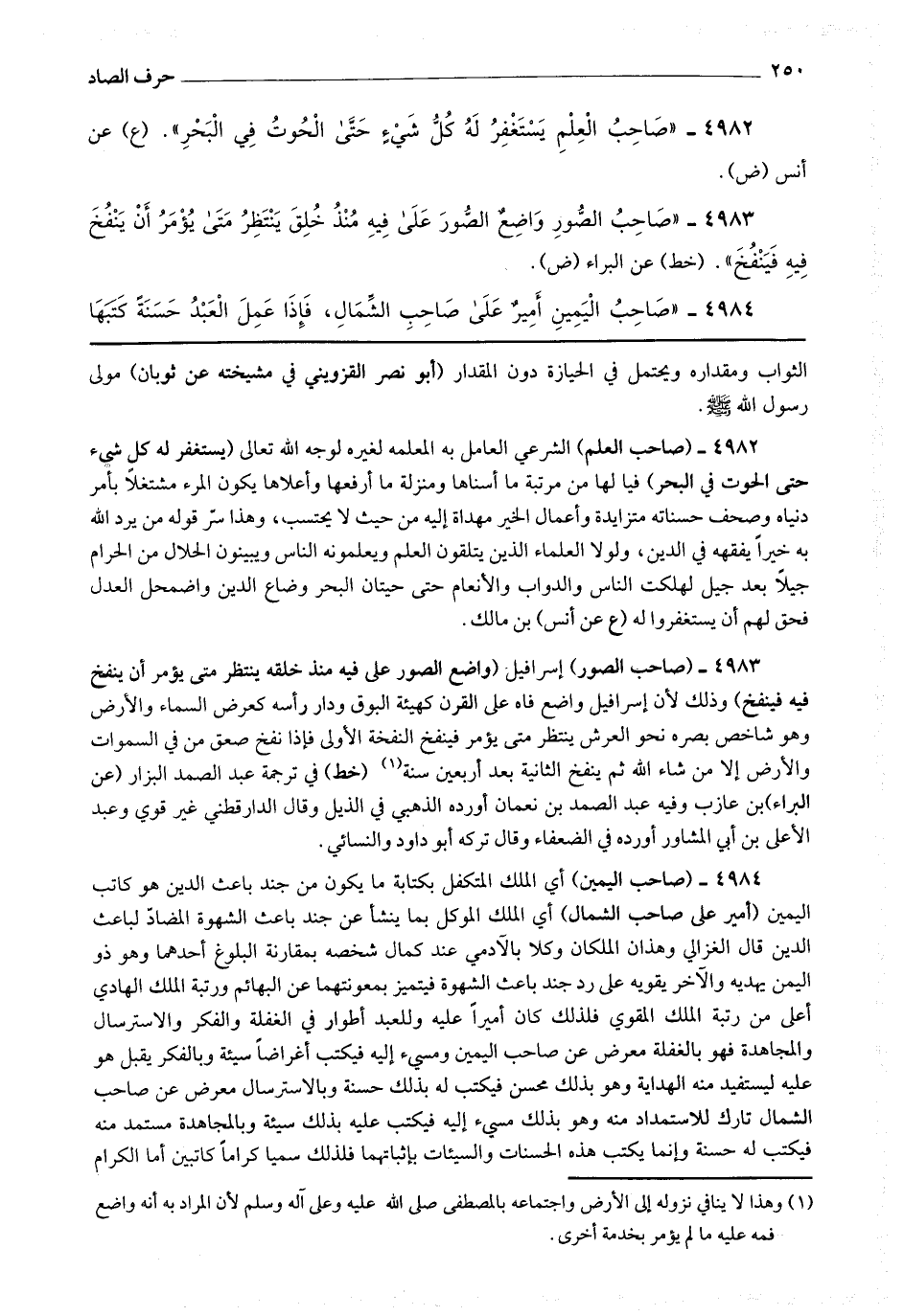 4983 - (صاحب الصور) إسرافيل (واضع الصور على فيه منذ خلقه ينتظر متى يؤمر أن ينفخ فيه فينفخ) وذلك لأن إسرافيل واضع فاه على القرن كهيئة البوق ودارة رأسه كعرض السماء والأرض وهو شاخص بصره نحو العرش ينتظر متى يؤمر فينفخ النفخة الأولى فإذا نفخ صعق من في السماوات والأرض إلا من شاء الله ثم ينفخ الثانية بعد أربعين سنة (1).