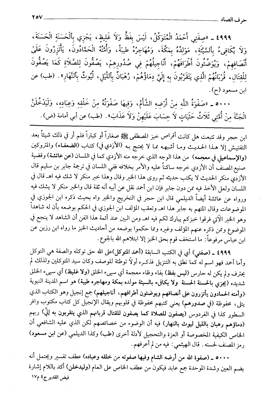 4999 - (صفتي) أي في الكتب السابقة (أحمد المتوكل) على الله حق توكله والصفة هي التوكل وأما أحمد فهو اسم له كما نطق به التنزيل فذكره أولا توطئة للوصف وكان سيد المتوكلين ولذلك لم يحترف ولم يكن له حارس (ليس بلفظ) بفاء وظاء معجمة أي سئ الخلق (ولا غليظ) أي سئ الخلق
