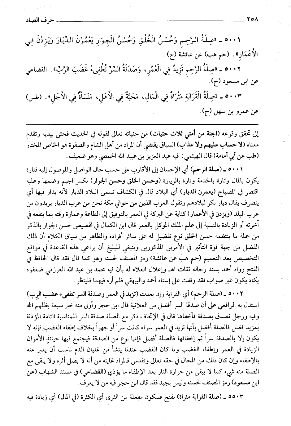 5001 - (صلة الرحم) أي الإحسان إلى الأقارب على حسب حال الواصل والموصول إليه فتارة يكون بالمال وتارة بالخدمة وتارة بالزيارة (وحسن الخلق وحسن الجوار) بكسر الجيم وضمها وعليه اقتصر في المصباح (يعمرن الديار) أي البلاد قال في الكشاف : تسمى البلاد الديار لأنه يدار فيها أي يتصرف يقال ديار بكر لبلادهم وتقول العرب الذين من حوالي مكة نحن من عرب الديار يريدون من عرب البلد (ويزدن في الأعمار) كناية عن البركة في العمر بالتوفيق إلى الطاعة وعمارة وقته بما ينفعه في آخرته أو الزيادة بالنسبة إلى علم الملك الموكل بالعمر قال ابن الكمال : في تخصيص حسن الجوار بالذكر من جملة ما ينتظمه حسن الخلق نوع تفضيل له على سائر أفراده والظاهر من سياق الكلام أن ذلك الفضل من جهة قوة التأثير في الأمرين المذكورين وينبغي للبليغ أن يراعي هذه القاعدة في مواقع التخصيص بعد التعميم.