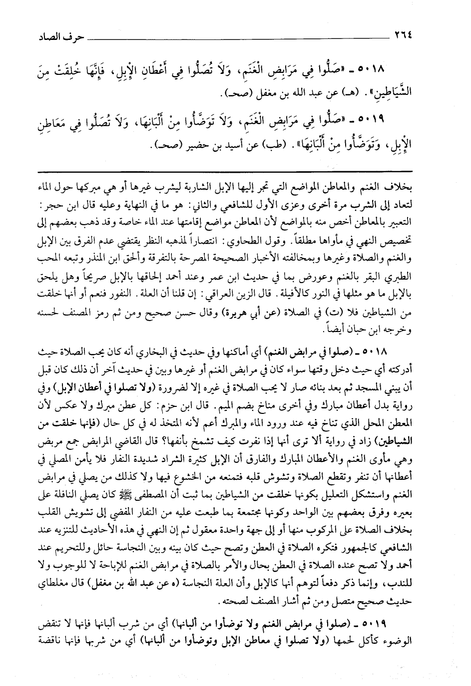 5019 - (صلوا في مرابض الغنم ولا توضأوا من ألبانها) أي من شرب ألبانها فإنها لا تنقض الوضوء كأكل لحمها (ولا تصلوا في معاطن الإبل وتوضأوا من ألبانها) أي من شربها فإنها ناقضة