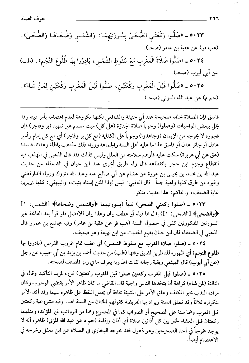5025 - (صلوا قبل المغرب ركعتين صلوا قبل المغرب ركعتين) كرره لمزيد التأكيد وقال في الثالثة (لمن شاء) كراهة أن يتخذها الناس واجبة قال القاضي : ما كان ظاهر الأمر يقتضي الوجوب وكان مراده الندب خير المكلف وعلق الأمر على المشيئة مخافة أن يحمل اللفظ على ظاهره سيما وقد أكد الأمر بتكراره ثلاثا وقد تطلق السنة ويراد بها الفريضة كقولهم الختان من السنة اه وفيه مشروعية ركعتين قبل المغرب وهما سنة على الصحيح أو الصواب كما في المجموع وهما من الرواتب غير المؤكدة ومثلهما ركعتان قبل العشاء لخبر بين كل أذانين صلاة أي أذان وإقامة.