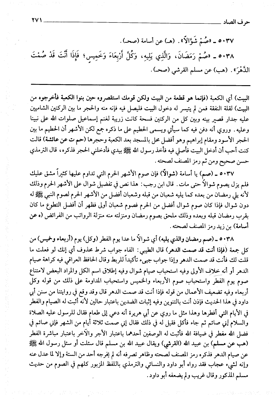 5037 - (صم) يا أسامة (شوالا) فإن صوم الأشهر الحرم التي تداوم عليها كثيرا مشق عليك فلم يزل يصوم شوالا حتى مات قال ابن رجب : هذا نص في تفضيل شوال على الأشهر الحرم وذلك لأنه يلي رمضان من بعده كما يليه شعبان من قبله وشعبان أفضل من الأشهر الحرم لصوم النبي صلى الله عليه وسلم له دون شوال فإذا كان صوم شوال أفضل من الحرم فصوم شعبان أولى فظهر أن أفضل التطوع ما كان بقرب رمضان قبله وبعده وذلك ملحق بصوم رمضان ومنزلته منه منزلة الرواتب من الفرائض.