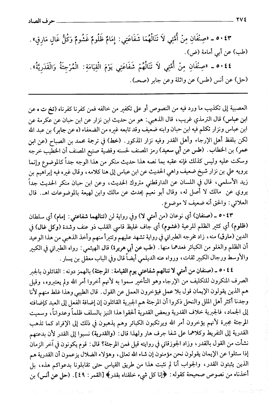 5044 - (صنفان من أمتي لا تنالهم شفاعتي يوم القيامة المرجئة) بالهمز دونه : القائلون بالجبر الصرف المنكرون للتكليف من الإرجاء وهو التأخير سموا به لأنهم أخروا أمر الله ولم يعتبروه وقيل : هم الذين يقولون الإيمان قول بلا عمل فيؤخرون العمل عن القول قال الطيبي : وهذا غلط منهم لأنا وجدنا أكثر أهل الملل والنحل ذكروا أن المرجئة هم الجبرية القائلون إن إضافة الفعل إلى العبد كإضافته إلى الجماد فالجبرية خلاف القدرية وبعض القدرية ألحقوا هذا النبز بالسلف ظلما وعدوانا وسميت المرجئة مجبرة لأنهم يؤخرون أمر الله ويرتكبون الكبائر وهم يذهبون في ذلك إلى الإفراط كما تذهب القدرية إلى التفريط وكلاهما على شفا جرف هار ولهذا قال (والقدرية) نسبوا إلى القدر لأن بدعتهم نشأت من القول بالقدر وزاد الجوزقاني في روايته قيل فمن المرجئة قال قوم يكونون في آخر الزمان إذا سئلوا عن الإيمان يقولون نحن مؤمنون إن شاء الله تعالى وهؤلاء الضلال يزعمون أن القدرية هم الذين يثبتون القدر والجواب أنا لم نثبت هذا من طريق القياس حتى تقابلونا بدعواكم هذه بل أخذناه من نصوص صحيحة كقوله * (إنا كل شئ خلقناه بقدر) *.