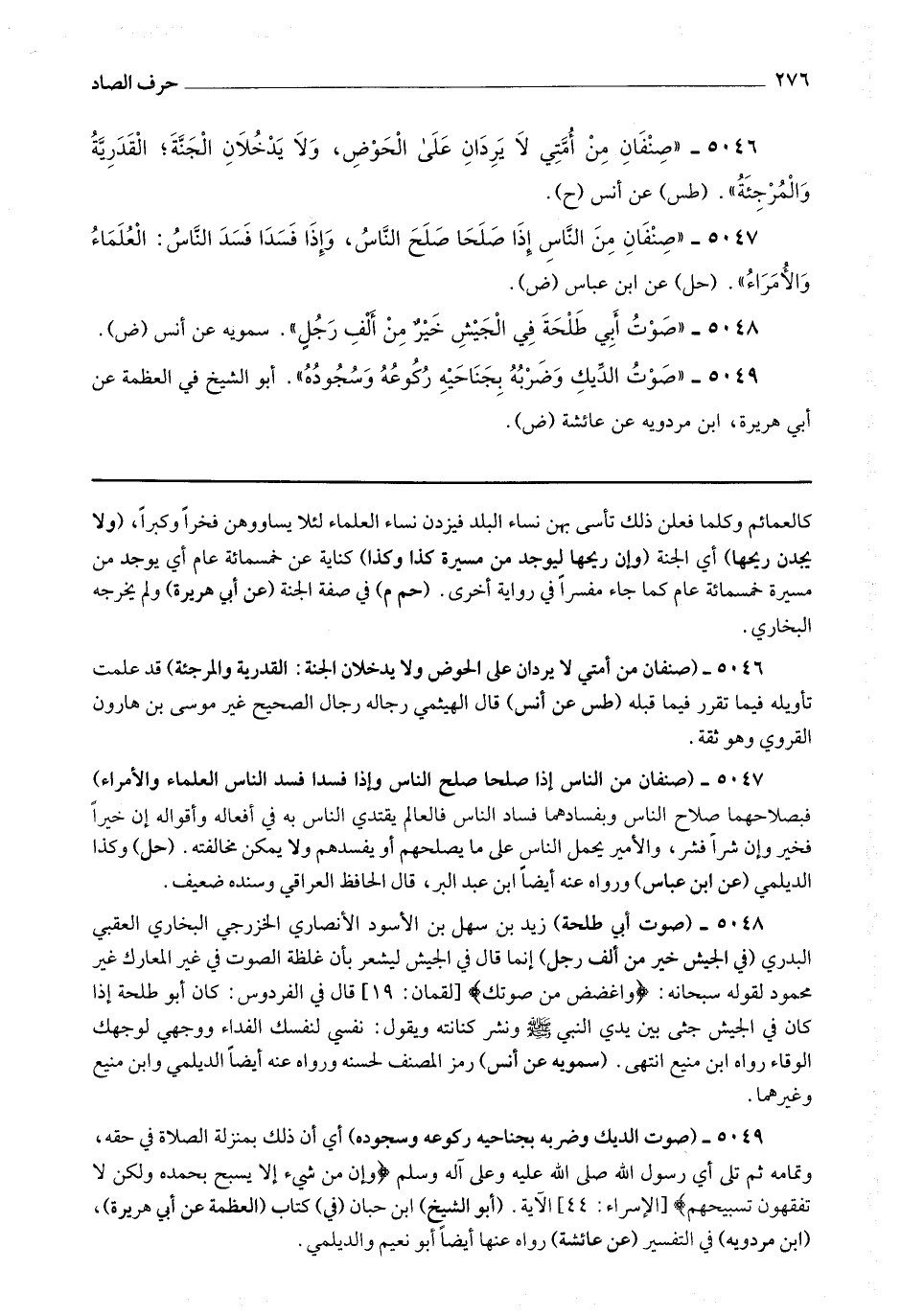 5047 - (صنفان من الناس إذا صلحا صلح الناس وإذا فسدا فسد الناس العلماء والأمراء) فبصلاحهما صلاح الناس وبفسادهما فساد الناس فالعالم يقتدي الناس به في أفعاله وأقواله إن خيرا فخير وإن شرا فشر والأمير يحمل الناس على ما يصلحهم أو يفسدهم ولا يمكن مخالفته.